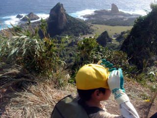 頂上から見る景色はこの島一番の絶景です。真下に見える分校などの集落や遠くに見える赤立神,また広い海を眺めました。登った記念に頂上に旗をたてました。