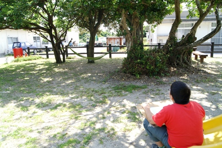 中学生は公園の木々とハンモックと小宝島に唯一あるポストを描きました。