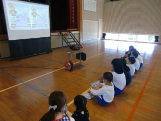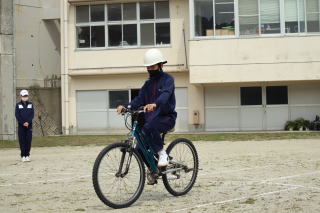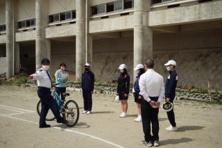 中之島駐在所の大野さんに来ていただて,交通安全教室が行われました。小学生は,登下校の仕方や危険な場所を確認しました。また,中学生は,自転車の乗り方や正しい交通マナーについて勉強しました。誰もが安全に過ごせるために,正しいマナーを身につけましょう。