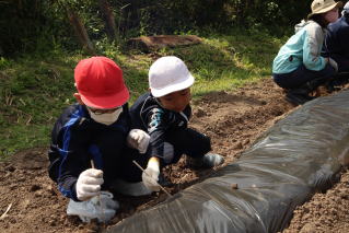 地域の方々の御協力もあり,さつまいも植えをすることができました。今年は,「紅はるか」と「シルクスイート」の2つを植えました。子どもたちもたくさん実ってほしい気持ちがあふれ出て,どんどん苗を植えていました。その後も丁寧に水をあげる姿が見られました。おいしいさつまいもが育つといいですね。