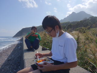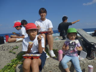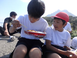 今回のお弁当給食は,小中くちっこ合同で前之浜に行きました。海を見ながら食べるお弁当は,日頃と違う環境のためかより美味しく感じます。このような機会を提供してくれた調理員の方に感謝です。