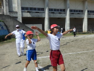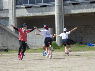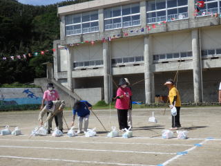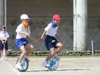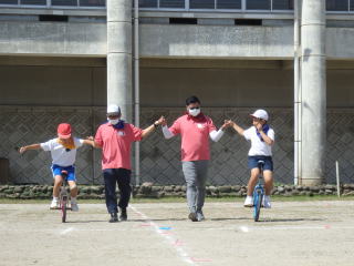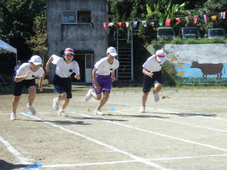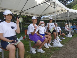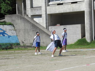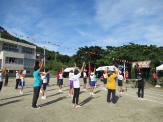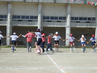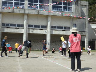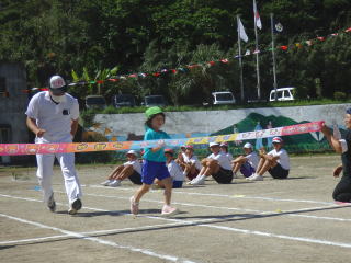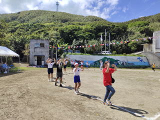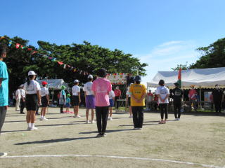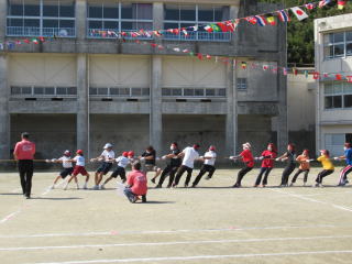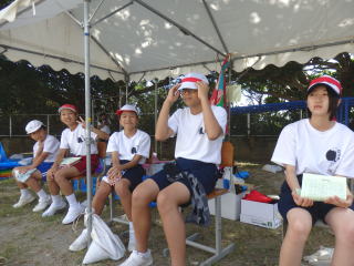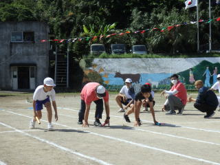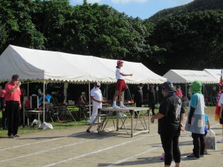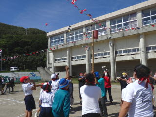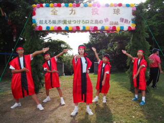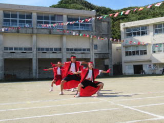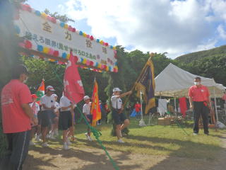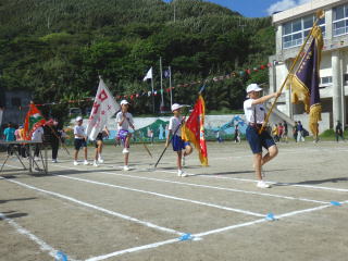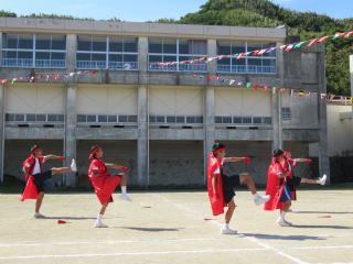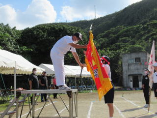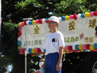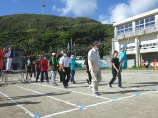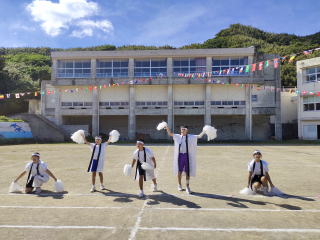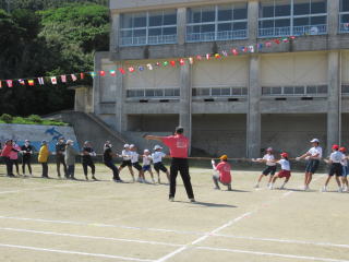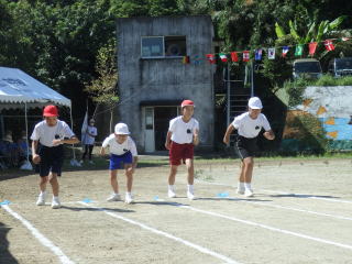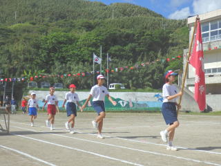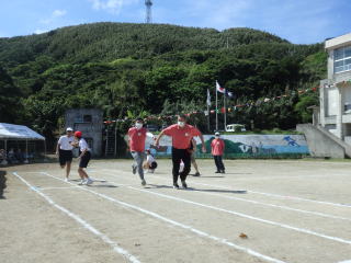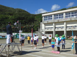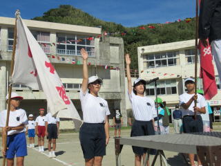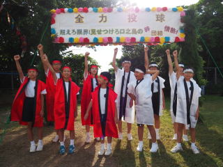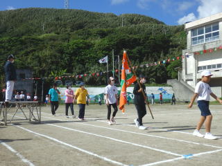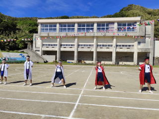 3年ぶりに、島民も一緒に参加する運動会が帰ってきました。入場門には島民の方々に立てて頂いた緑門ができ、そこから入場する子どもたちも誇らしげです。ミミズの綱引きや一升瓶リレーなど、島民が参加する種目もありました。また、子どもたちは日頃練習してきたバトンパスや一輪車の演技、応援合戦など一所懸命に取り組む姿が見られました。最後は、応援の部は白組が、総合優勝は紅組がとりました。スローガンである「全力投球~超えろ限界!見せつけろ 口之島の絆・団結・情熱~」の通り、全力で取り組むいい運動会になりました。