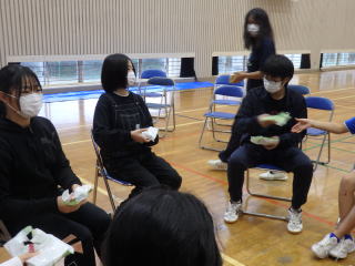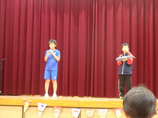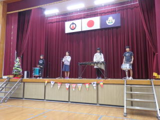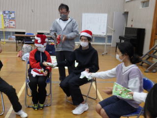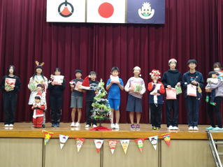 12月24日はクリスマスです。今年も子ども会の運営のもと、クリスマス会を開催しました。まず、くちっこ園のYさんの開会のあいさつで始まりました。そして、くちっこ園のダンス、小学2・3年生の鍵盤ハーモニカとリコーダーの演奏、小学5・6年生の楽器の演奏、中学生の楽器の演奏とそれぞれの学級ごとに発表しました。最後には、みんなで「パプリカ」の合唱とダンスをしました。発表が終わった後には、クリスマスプレゼントをもらうことができました。子どもたちの楽しそうな笑顔が見ることができてよかったです。準備・運営して頂いた子ども会育成会の皆さん、ありがとうございました。