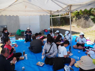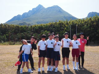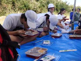 レクリエーション以外にも自由時間にバレーやサッカーをして楽しみました。また、お菓子の時間はみんなお菓子を見せあいながら、楽しそうに食べていました。口之島小中学校は、お弁当給食です。日ごろ、学校で食べる給食が、お弁当になります。口之島の調理員さんのお弁当は、とてもおいしいので、遠足の楽しみの1つです。口いっぱいにほおばりながら食べました。