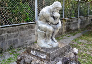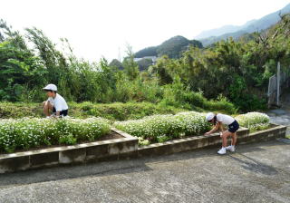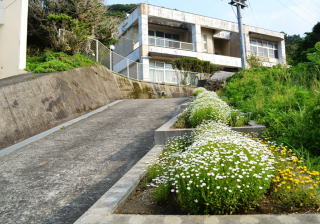 小学校の校舎は,中学校の校舎からさらに上がった高台にあり,校庭から続く坂道を上ると玄関があります。このスロープの脇には花壇が設置されていて,児童生徒が手入れをしています。眼下には太平洋が見え,とても眺めの良い場所です。また,スロープの近くには「考える人」の銅像があります。