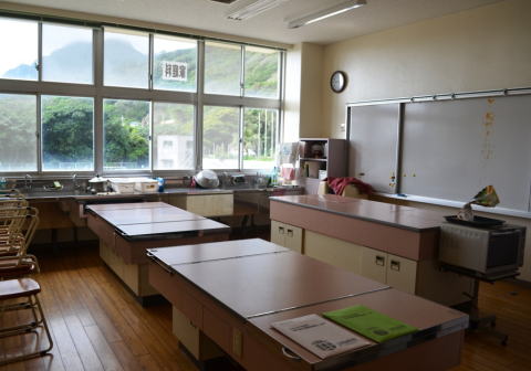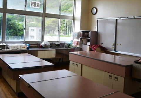 中学校舎1階の一番奥に「家庭科室」があります。家庭科の授業はここで行われています。調理実習に使用する調理器具などが,たくさん置かれています。