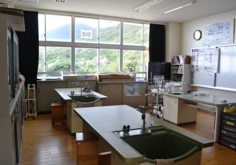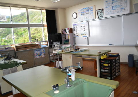 中学校舎2階の一番奥には,理科室があります。小学生と中学生の理科の授業で使われています。顕微鏡や試験管など,たくさんの実験・観察道具や薬品などが,所狭しと並んでいます。