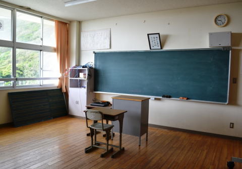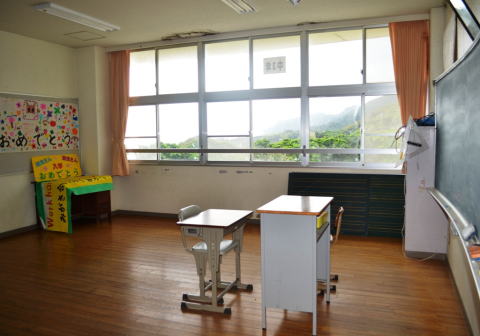 中学3年生の教室です。中学1,2年生と合同授業もこの教室が使われています。教室の窓からは,前岳や太平洋がとてもきれいに見えます。