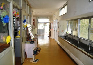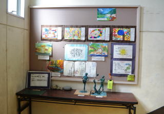 小学校舎の廊下には,いろいろな掲示物が掲示されています。階段には図工の作品など,児童の作品が展示されています。また,2階の廊下には本も並べられています。