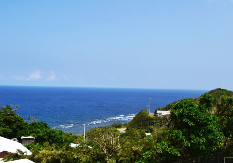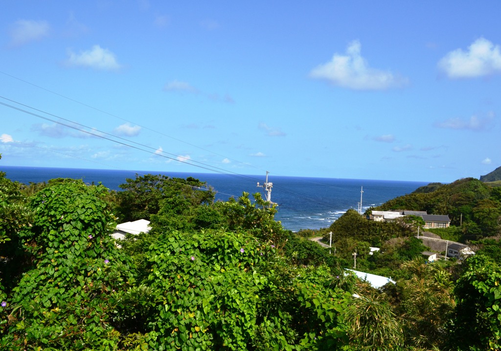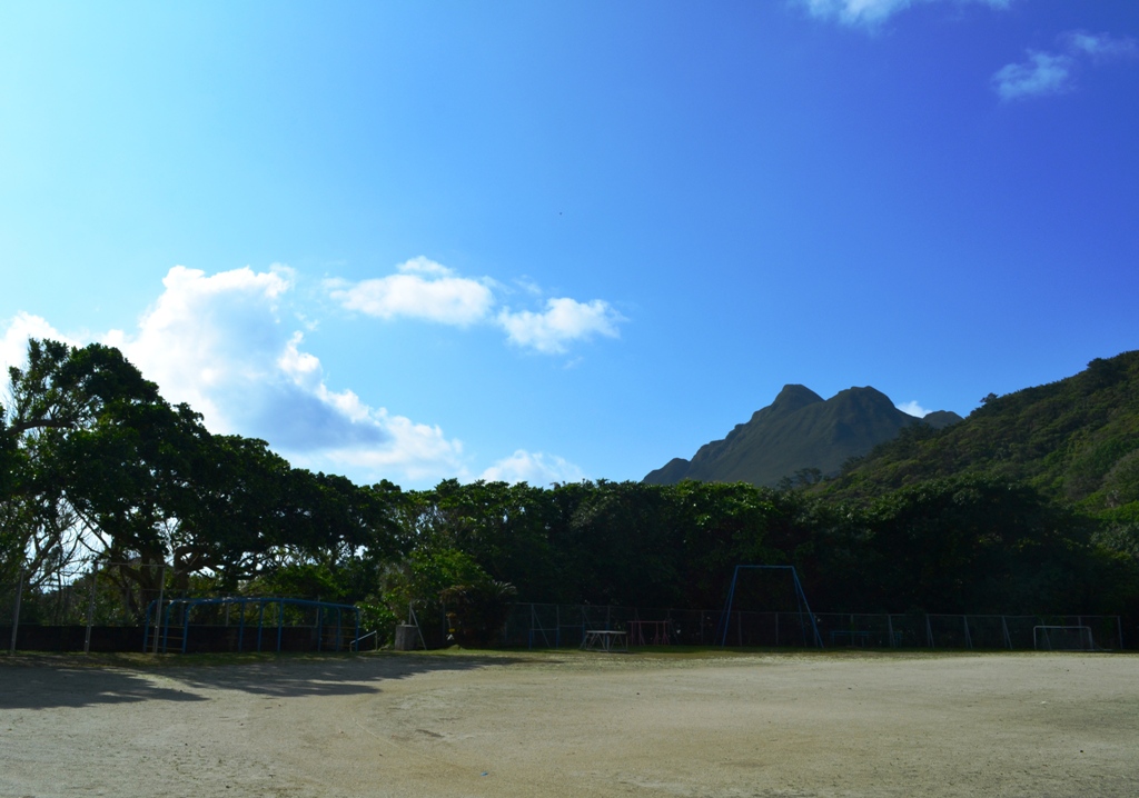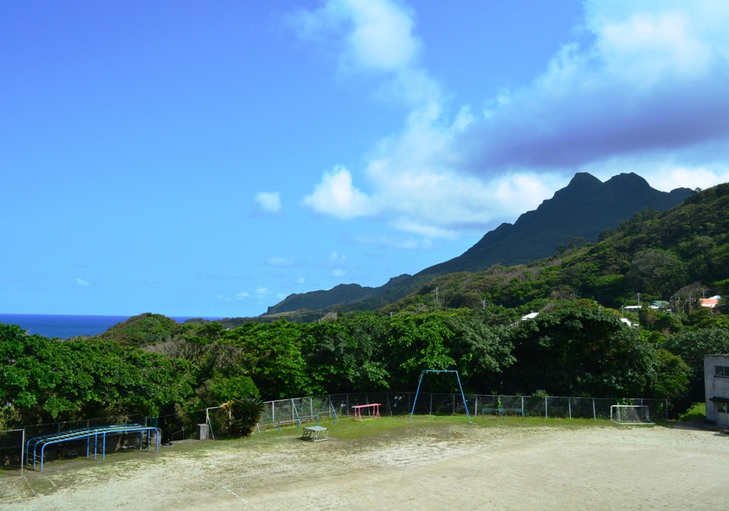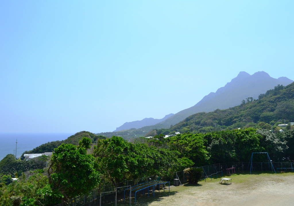 口之島小・中学校から見える風景を紹介します。口之島最高峰の前岳や,青く広がる太平洋など,口之島ならではの素晴らしい絶景を見ることができます。雄大な自然のもとで,子どもたちはのびのびと学校生活を送っています。
