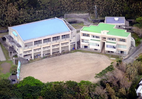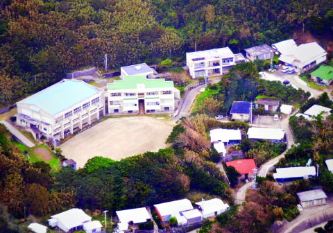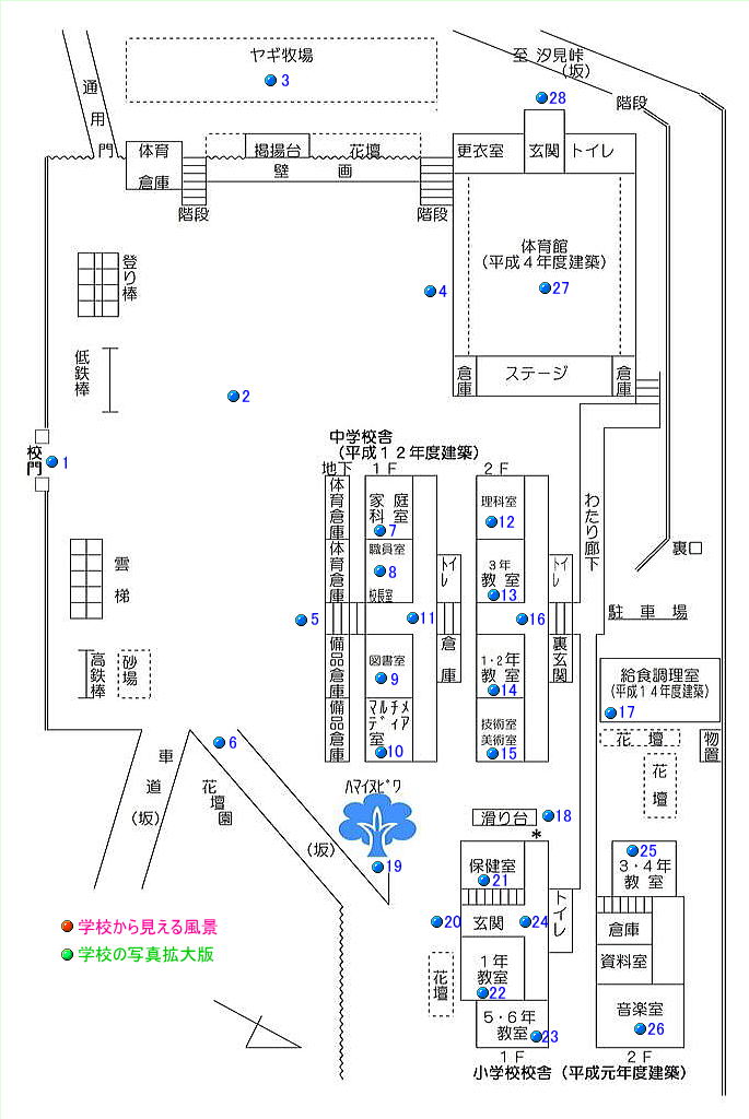 1 校門 2 校庭 3 ヤギ牧場 4 体育館下 5 中学校舎玄関 6 小学校舎下スロープ 7 家庭科室 8 職員室 9 図書室 10 マルチメディア室 11 中学校舎1階廊下 12 理科室 13 中学3年教室 14 中学1,2年教室 15 技術室・美術室 16 中学校舎2階廊下 17 給食調理室 18 滑り台 19 ハマイヌビワの木 20 小学校舎玄関 21 保健室 22 小学1年教室 23 小学5,6年教室 24 小学校舎廊下 25 小学3,4年教室 26 音楽室 27 体育館(へき地集会室) 28 体育館玄関 学校から見える風景 学校の写真拡大版 |