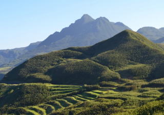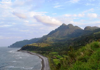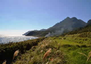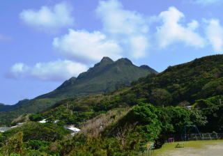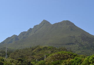 前岳は口之島の最高峰で,標高628.3mです。島内のどこからでもその雄大な山容を眺めることができ,口之島のシンボル的な存在です。口之島小・中学校からも,前岳の美しい姿を見ることができます。