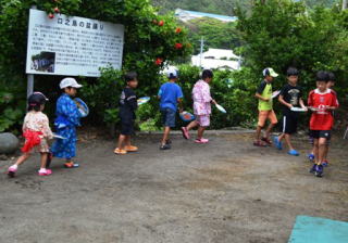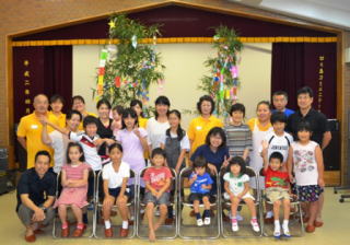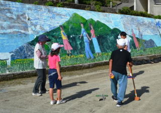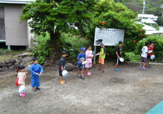 毎月一回,島民が集まって「いきいき教室」を行っています。グラウンドゴルフや七夕飾りづくり,花壇への花植えなど,その月に応じたいろいろな活動を行っています。子どもたちと大人が一緒になって楽しめる行事です。 |