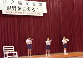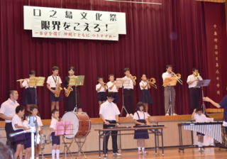 10月に,学校と地域が合同で「口之島文化祭」を行っています。児童生徒は,劇やソーラン,金管バンドなどの舞台発表,学習した成果の展示発表をします。また,地域の方々も舞台発表,展示などを一緒に行います。島民の方々がとても楽しみにしており,毎年島外からも多くの方々が参加します。。 「第29回口之島文化祭」(H29.10.7)の様子はこちら 「第28回口之島文化祭」(H28.10.8)の様子はこちら 「第27回口之島文化祭」(H27.10.10)の様子はこちら |