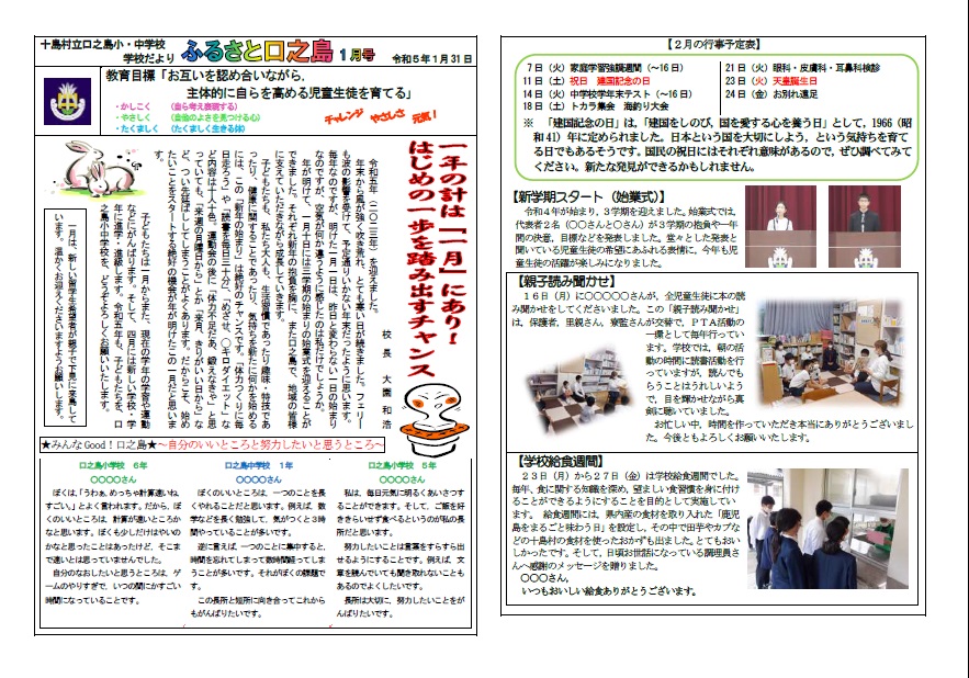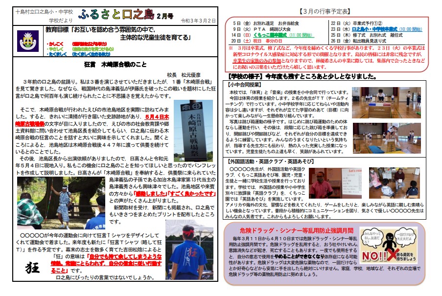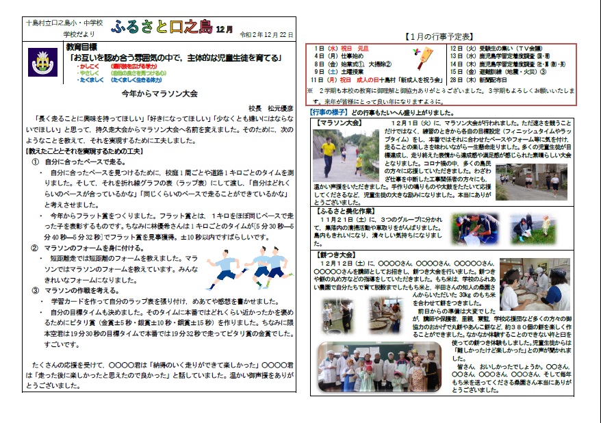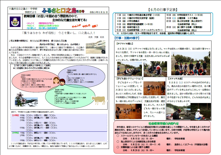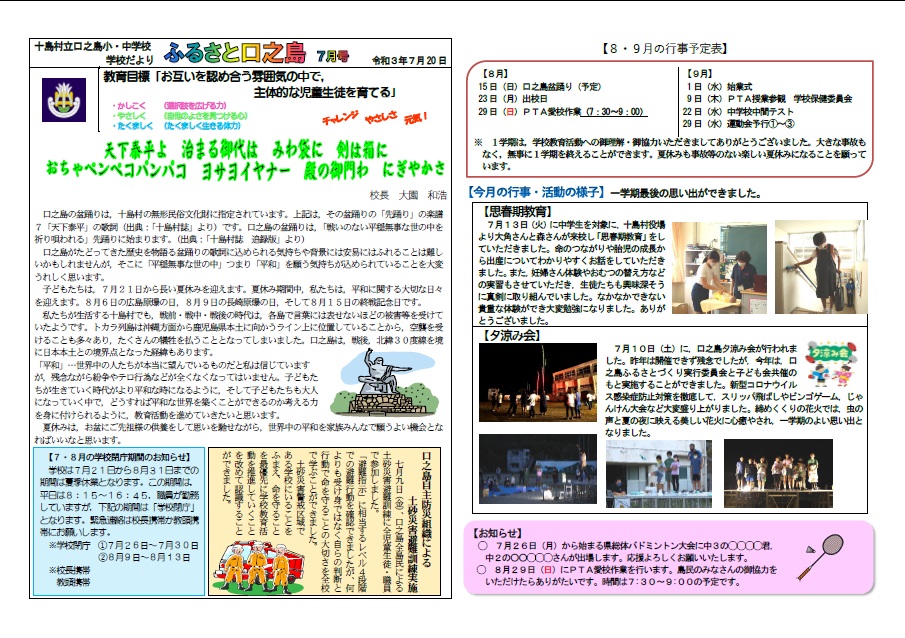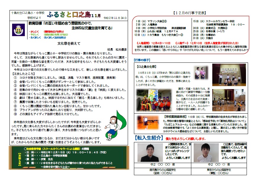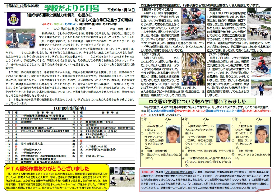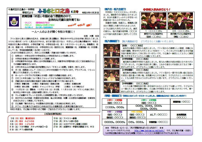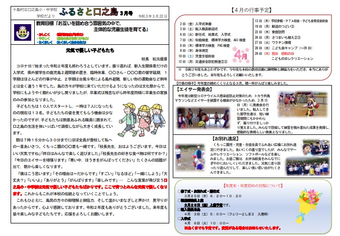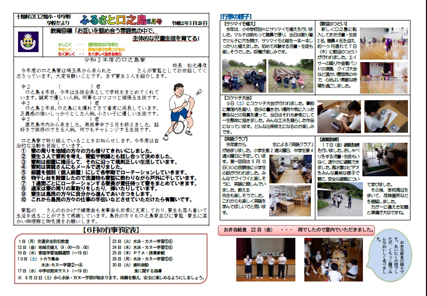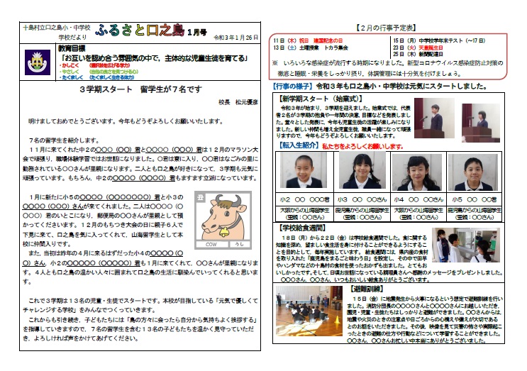 毎月発行している,「学校だより」を掲載します。PDF形式を見るには,「Adobe Reader」等の閲覧ソフトウェアが必要です。画像形式はそのままご覧いただけます(画像はJPEG形式です)。なお,プライバシー保護のため,写真にはぼかしを入れ,個人名等は削除してありますのでご了承下さい。
