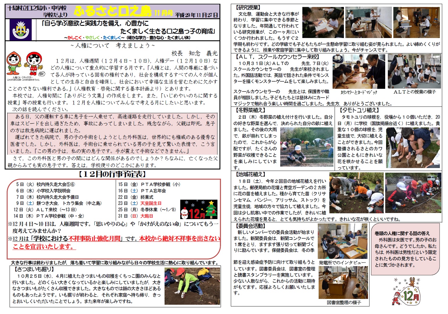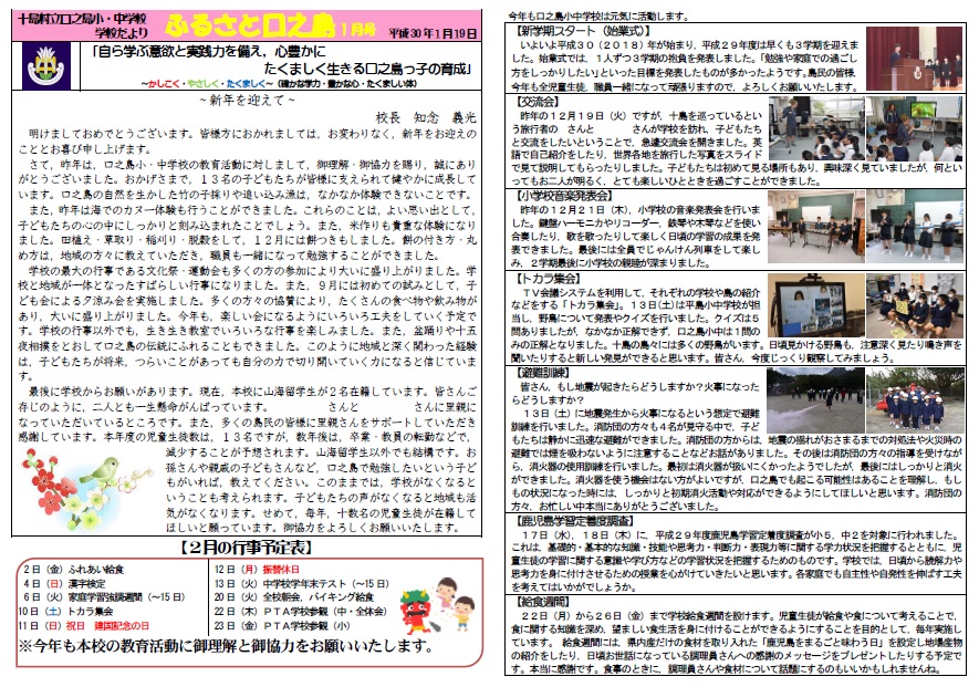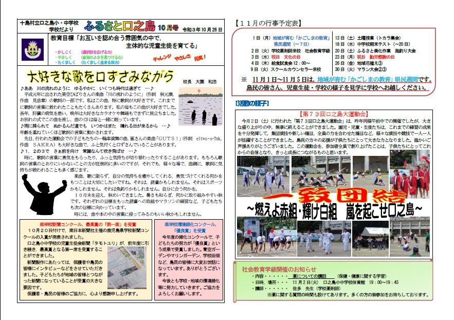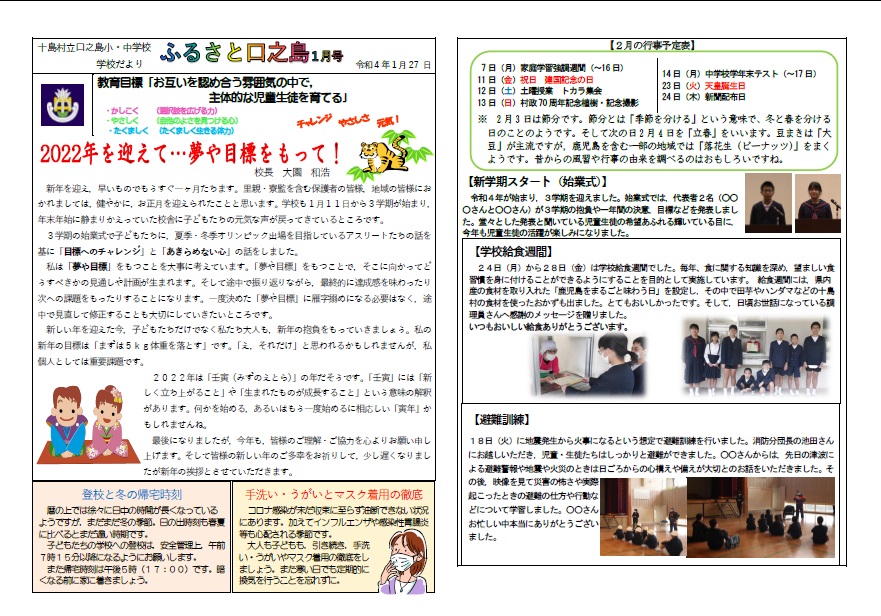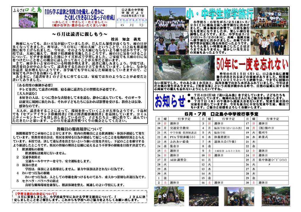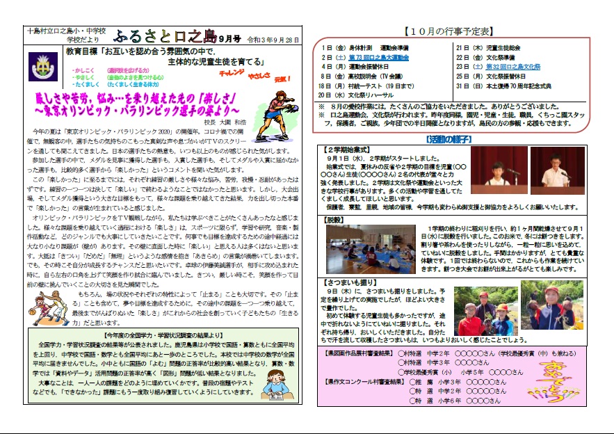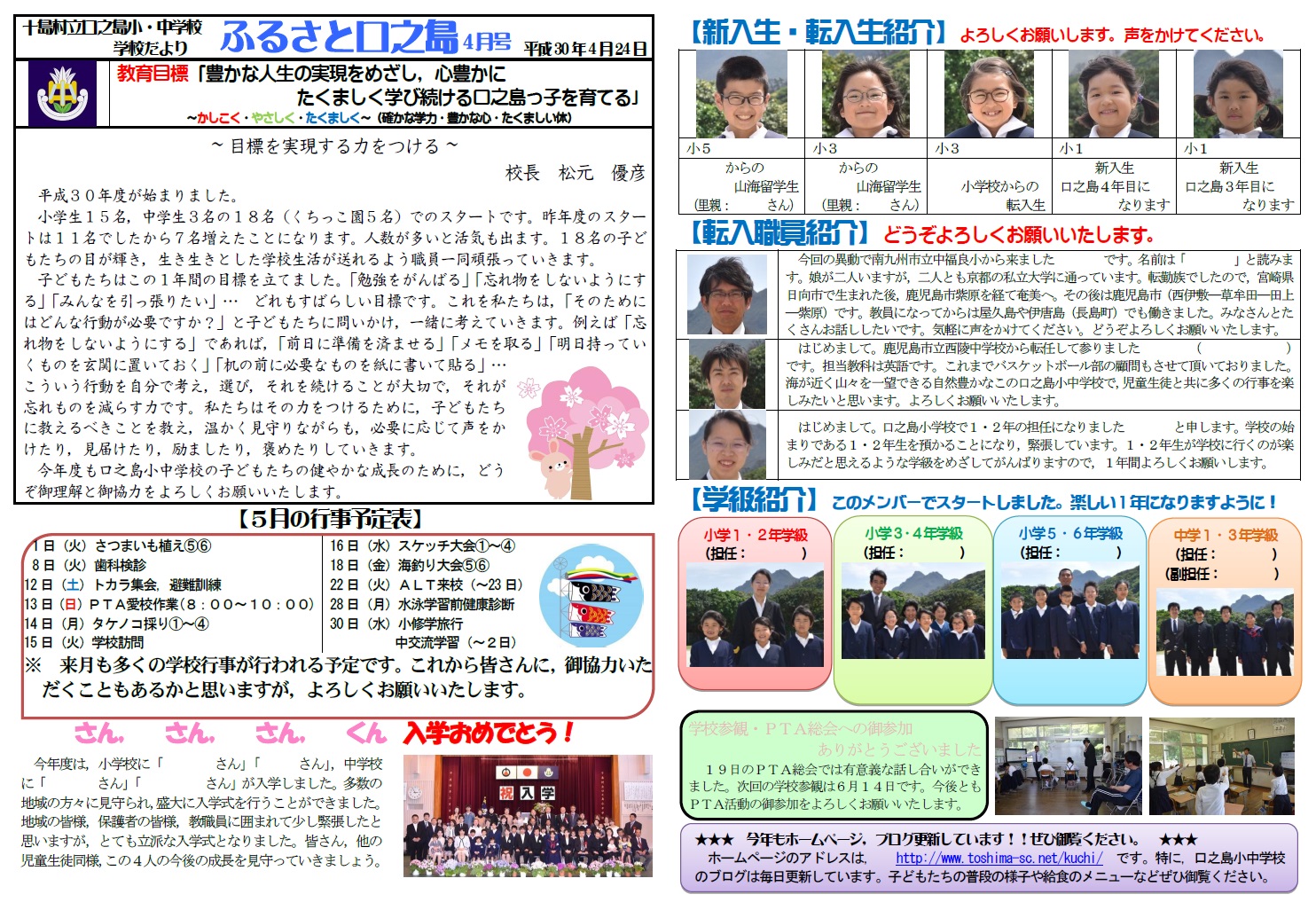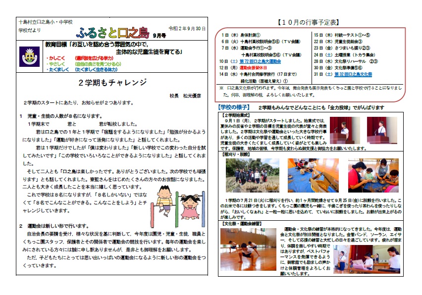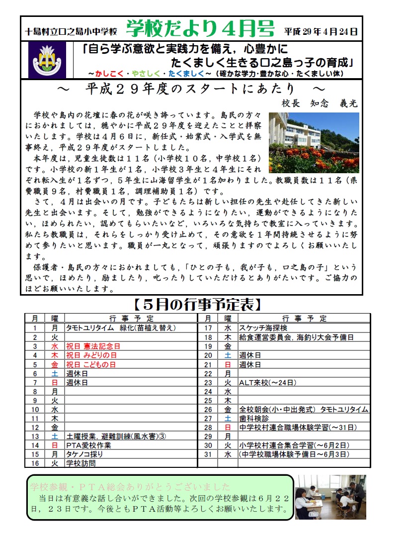毎月発行している,「学校だより」を掲載します。PDF形式を見るには,「Adobe Reader」等の閲覧ソフトウェアが必要です。画像形式はそのままご覧いただけます(画像はJPEG形式です)。なお,プライバシー保護のため,写真にはぼかしを入れ,個人名等は削除してありますのでご了承下さい。
