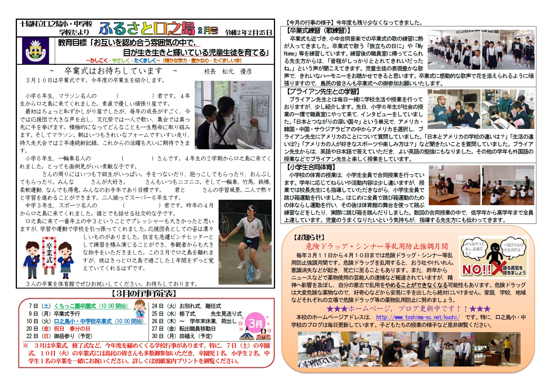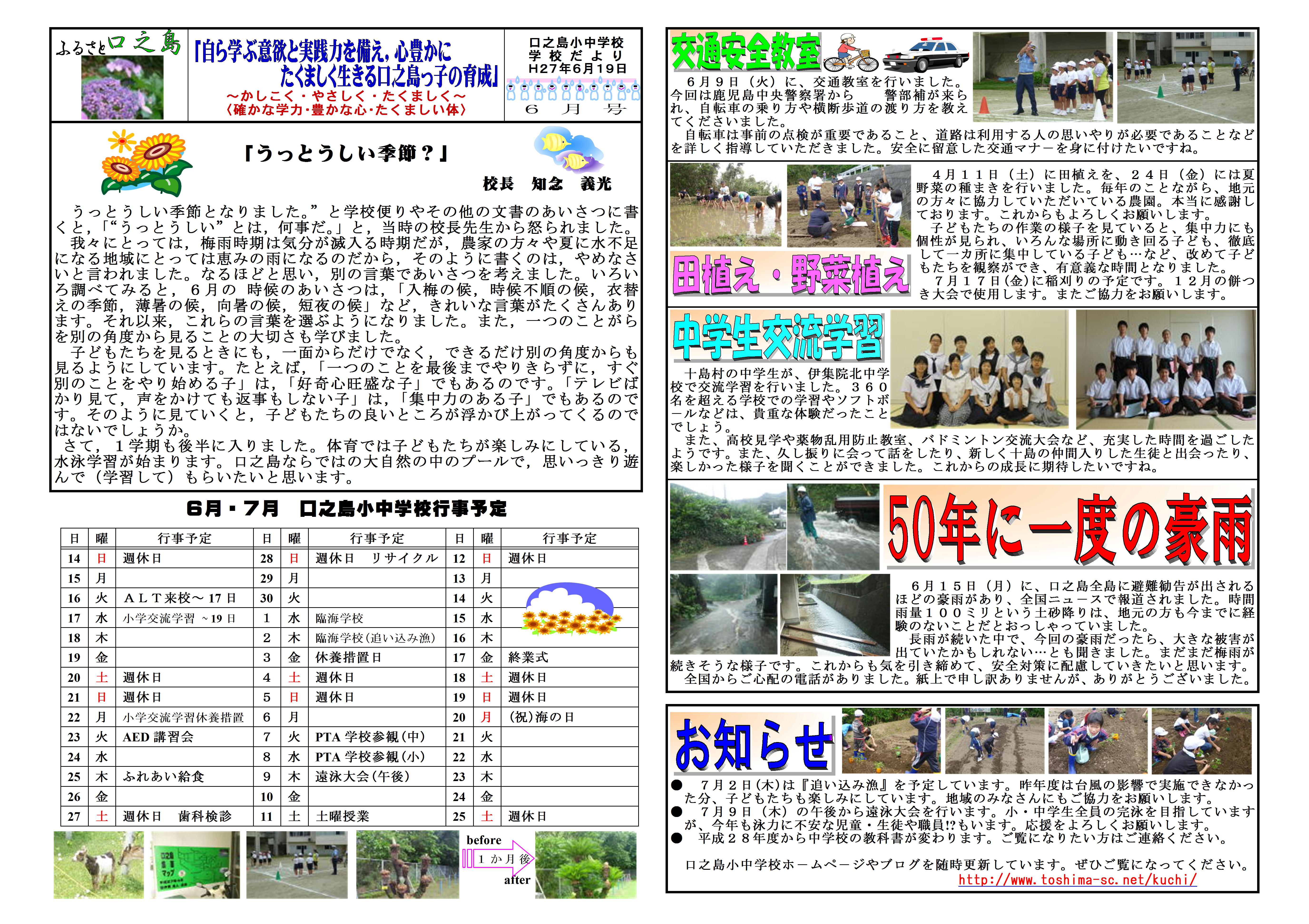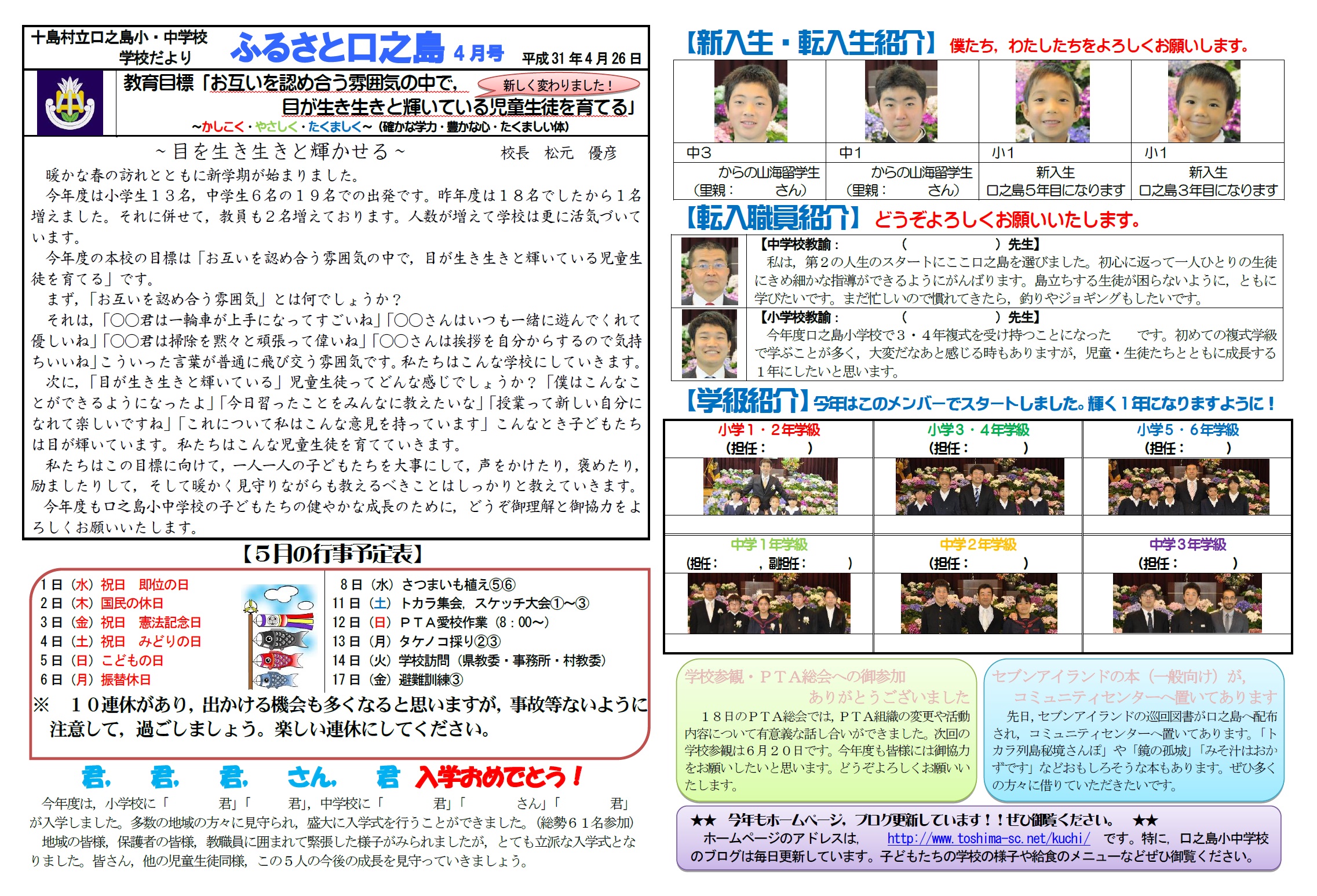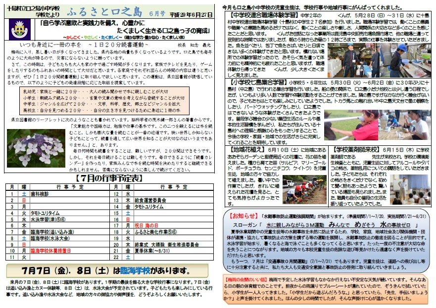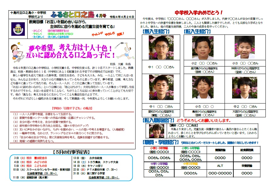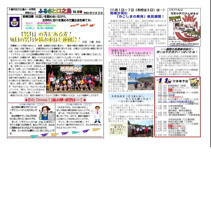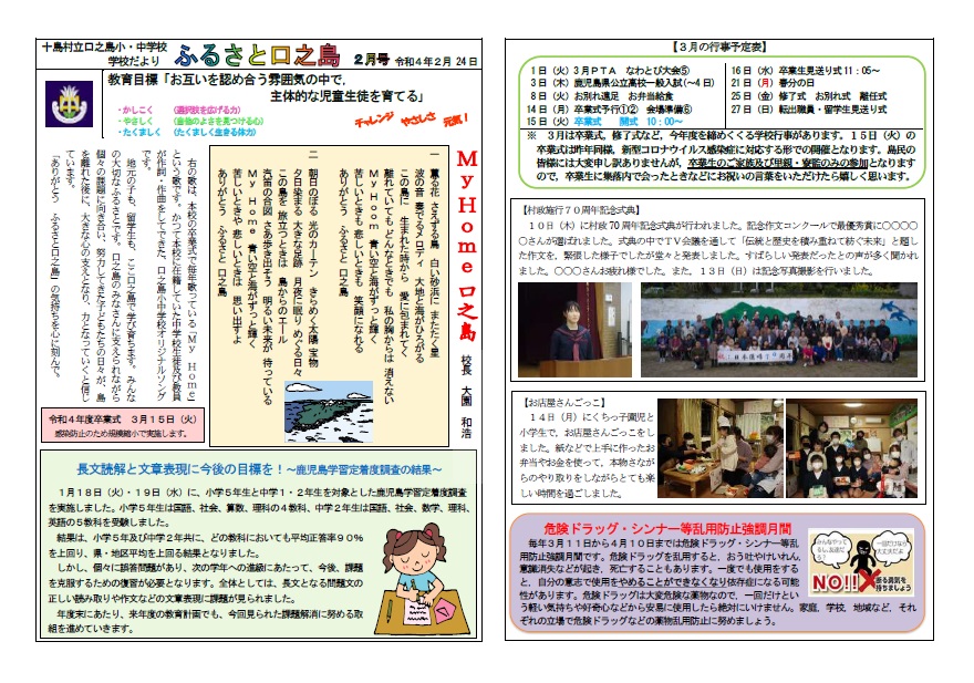 毎月発行している,「学校だより」を掲載します。PDF形式を見るには,「Adobe Reader」等の閲覧ソフトウェアが必要です。画像形式はそのままご覧いただけます(画像はJPEG形式です)。なお,プライバシー保護のため,写真にはぼかしを入れ,個人名等は削除してありますのでご了承下さい。