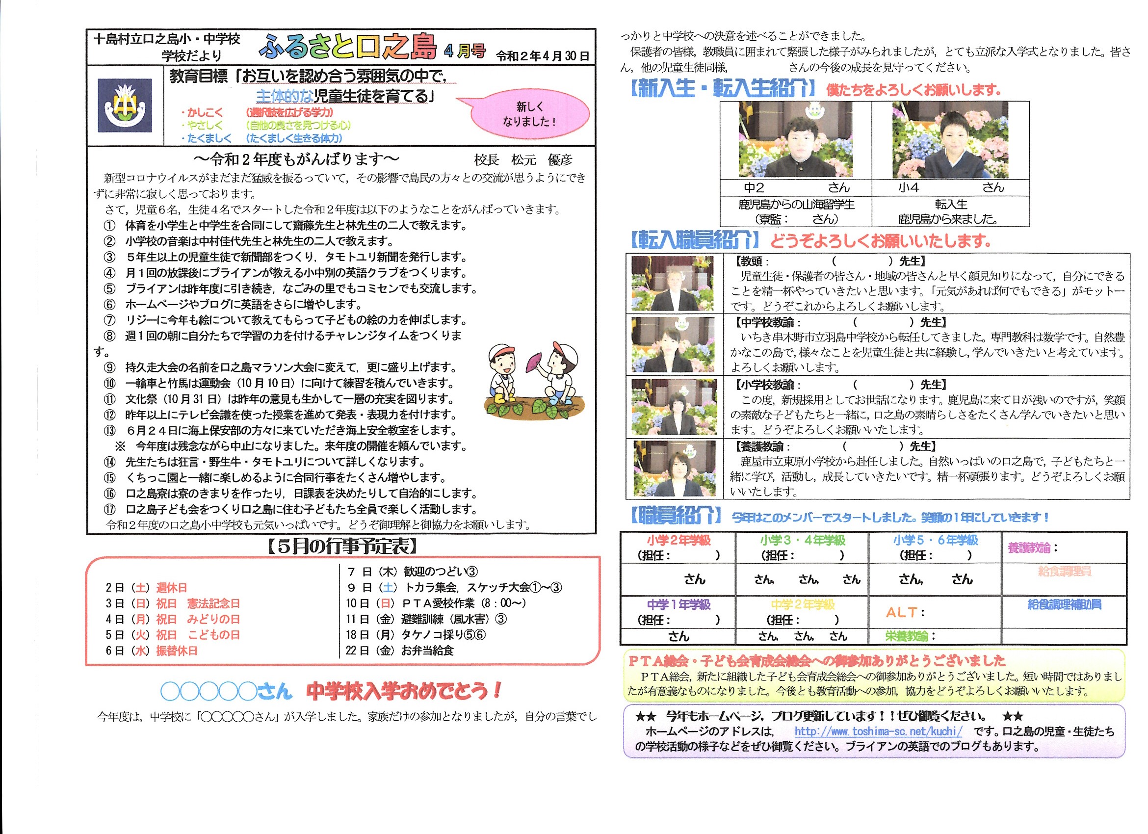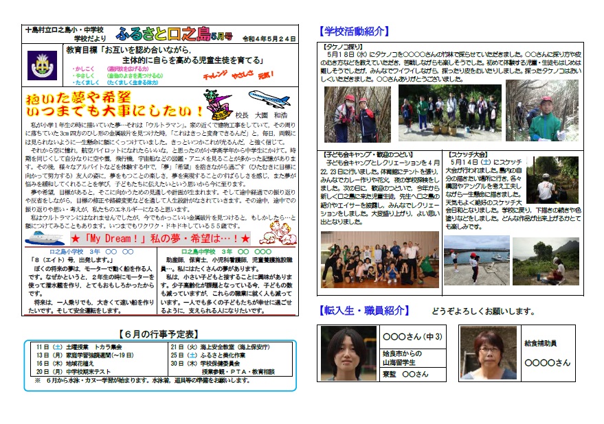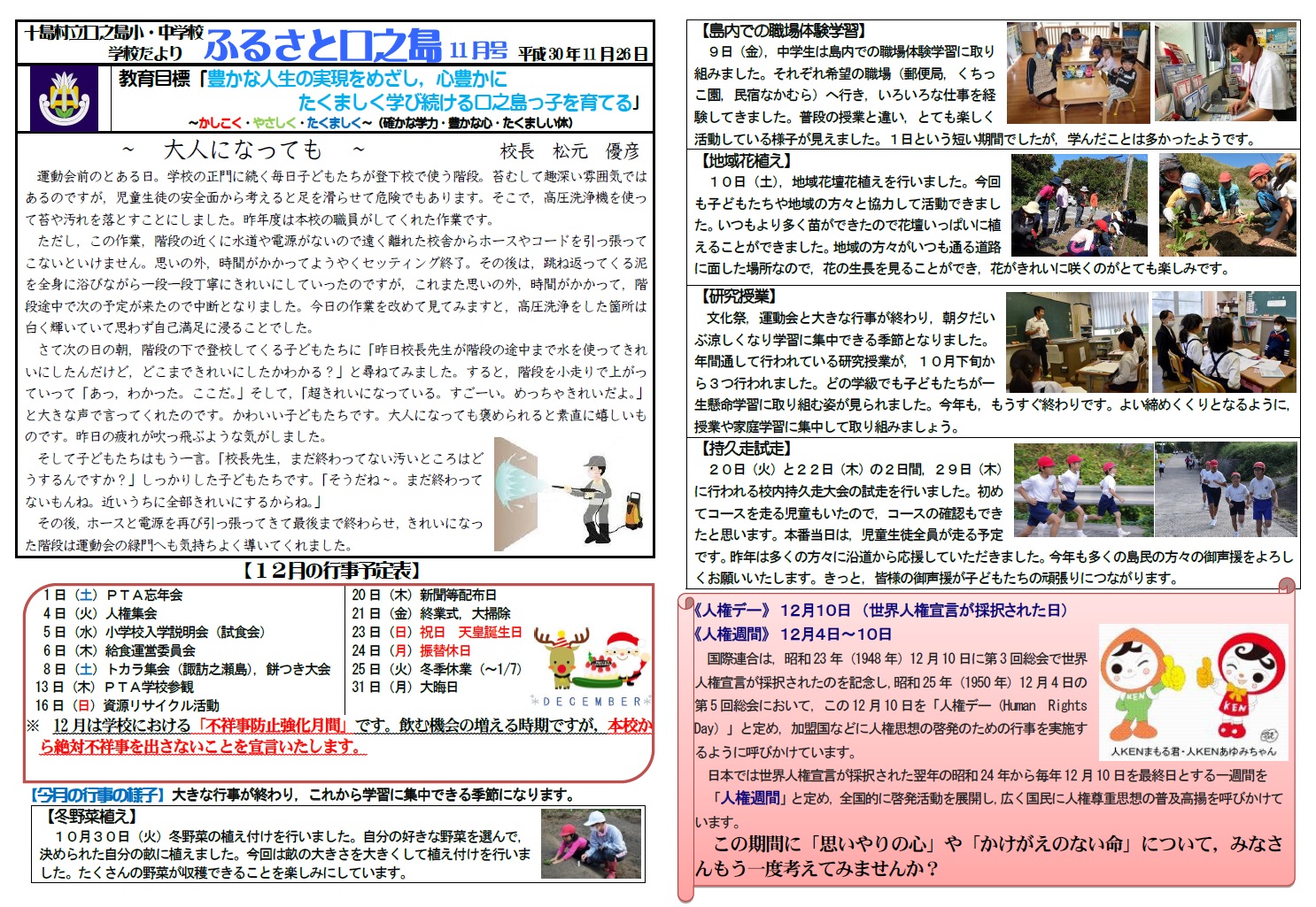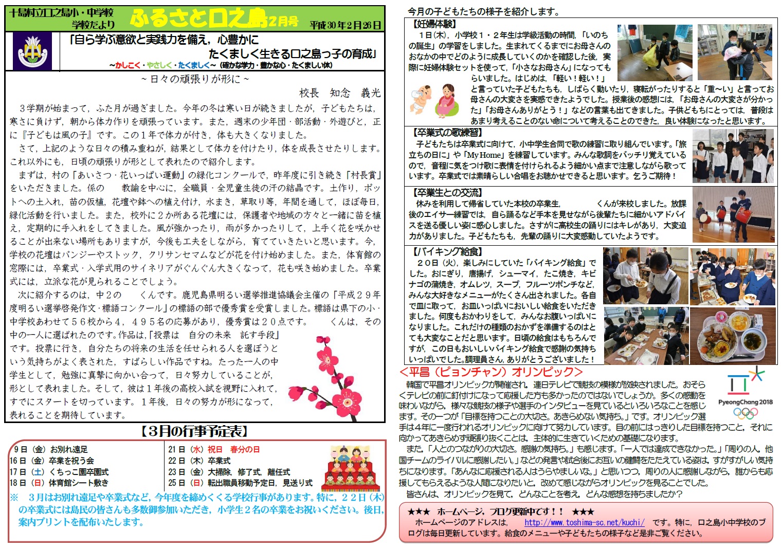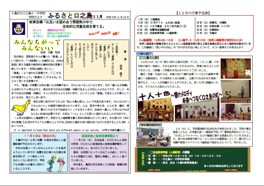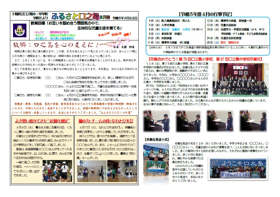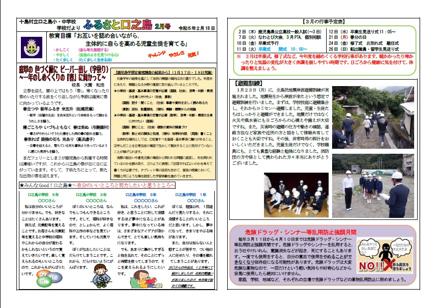 毎月発行している,「学校だより」を掲載します。PDF形式を見るには,「Adobe Reader」等の閲覧ソフトウェアが必要です。画像形式はそのままご覧いただけます(画像はJPEG形式です)。なお,プライバシー保護のため,写真にはぼかしを入れ,個人名等は削除してありますのでご了承下さい。