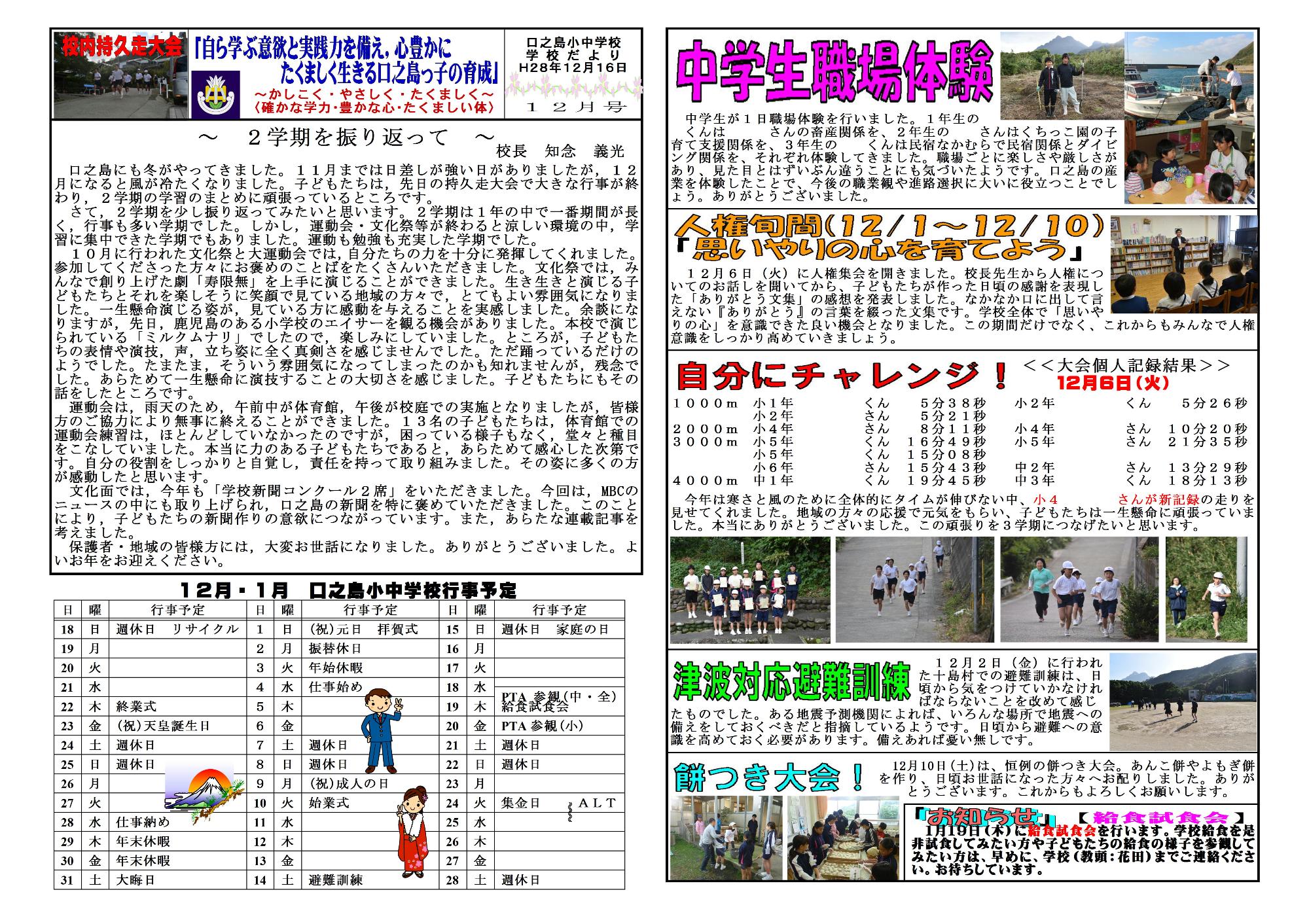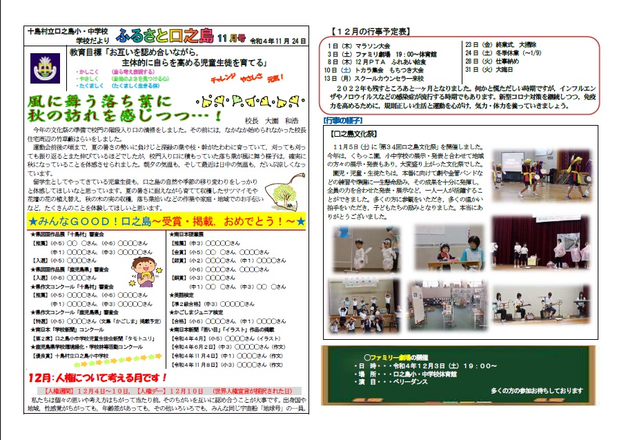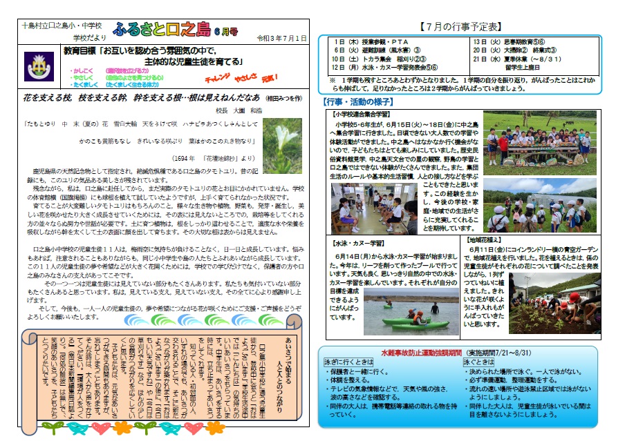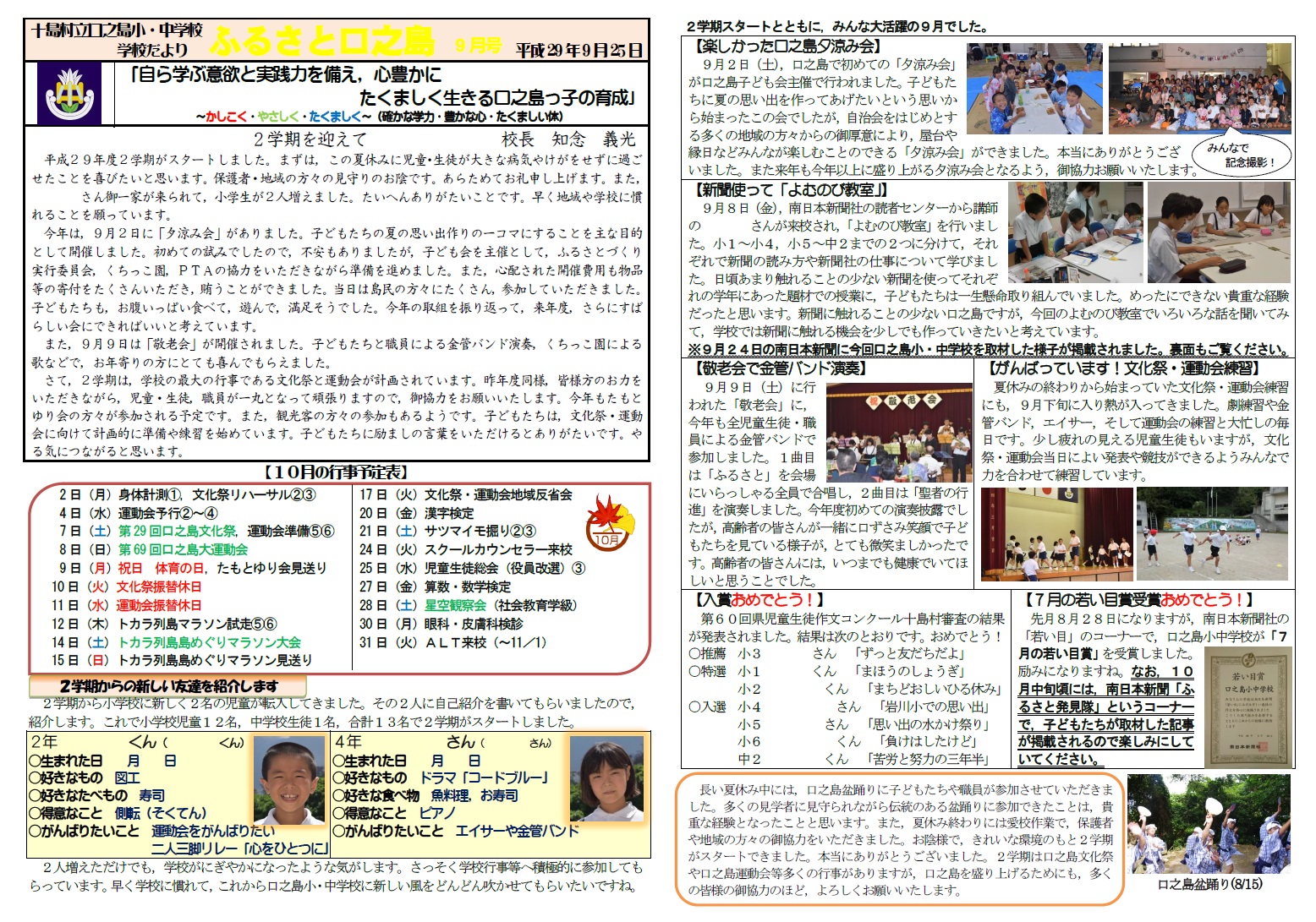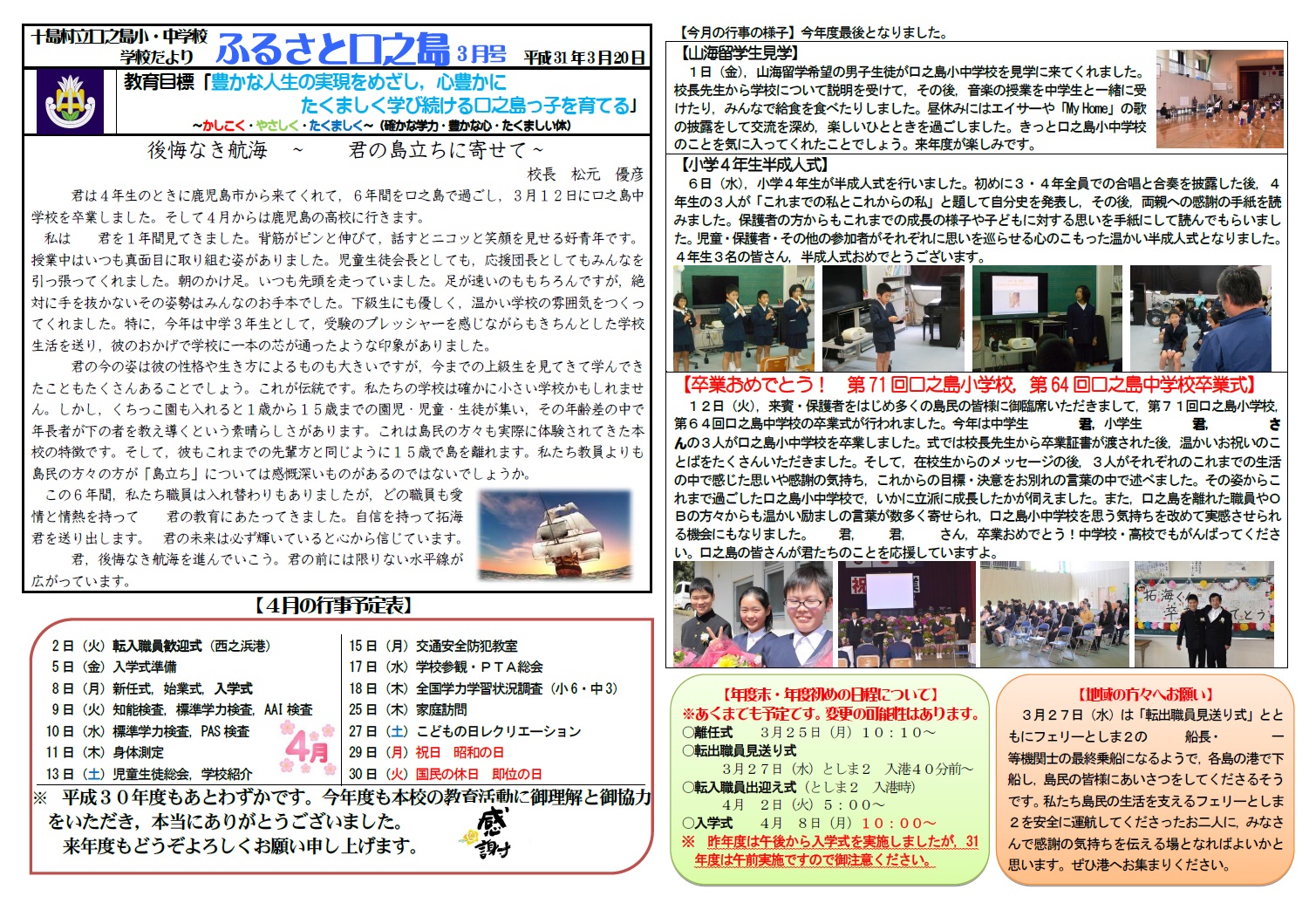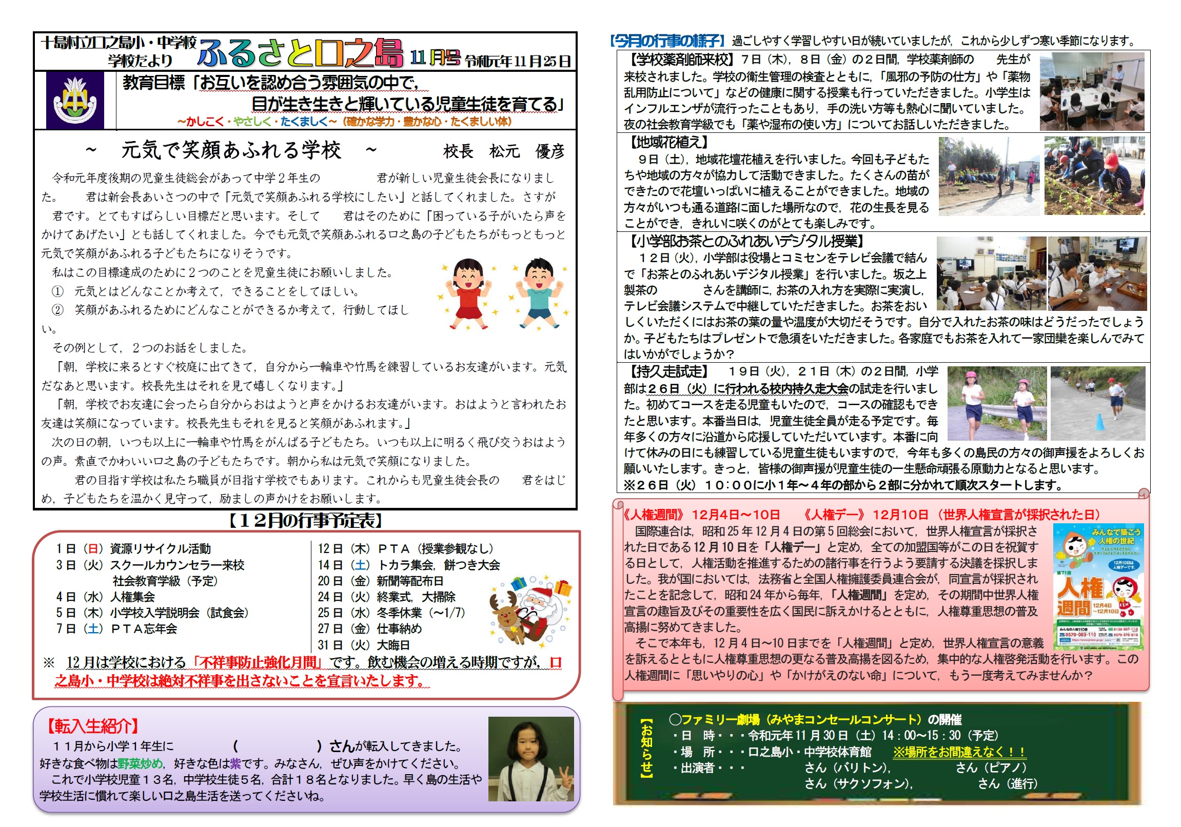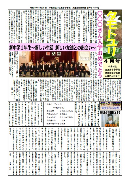 毎月発行している,「学校だより」を掲載します。PDF形式を見るには,「Adobe Reader」等の閲覧ソフトウェアが必要です。画像形式はそのままご覧いただけます(画像はJPEG形式です)。なお,プライバシー保護のため,写真にはぼかしを入れ,個人名等は削除してありますのでご了承下さい。