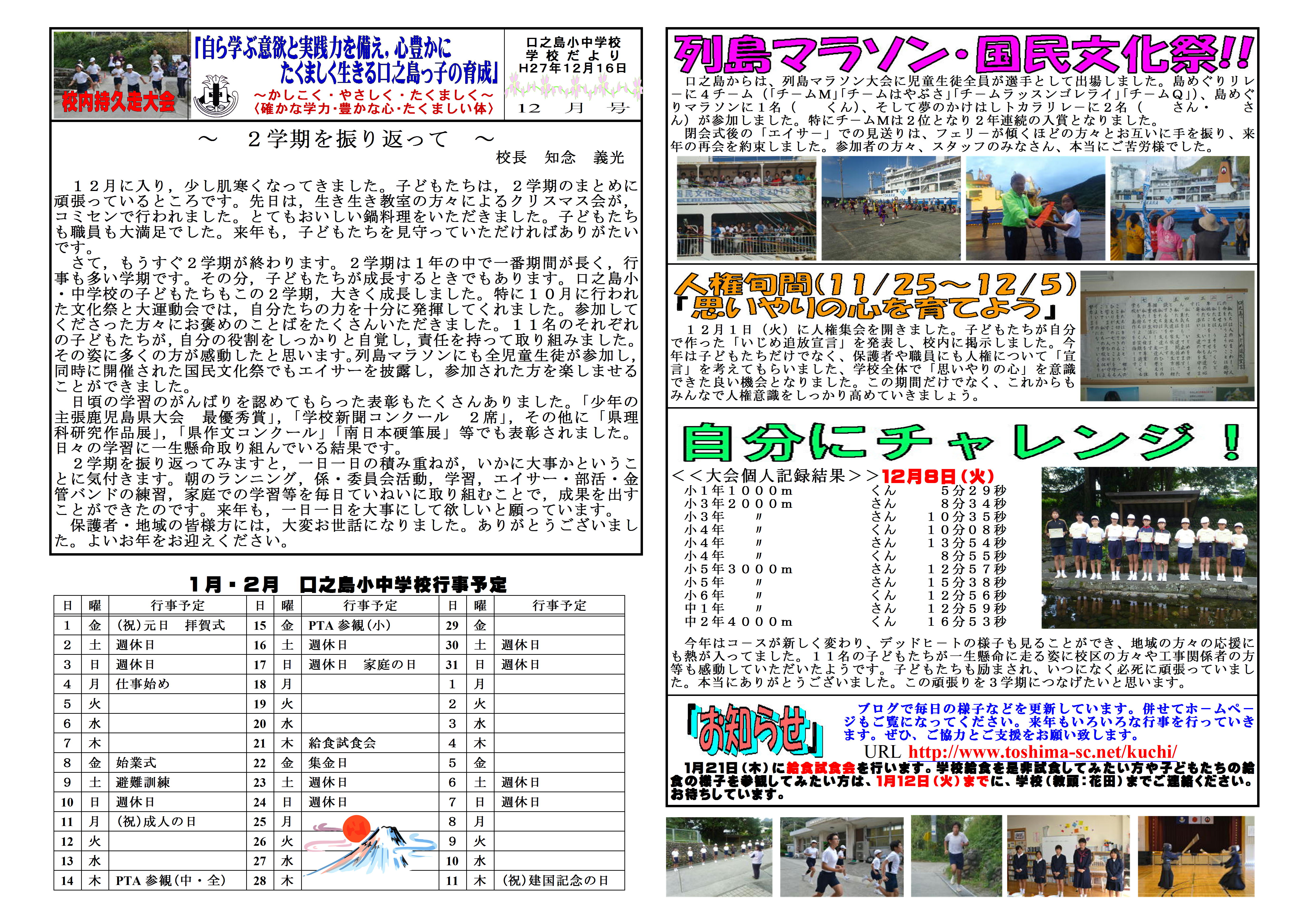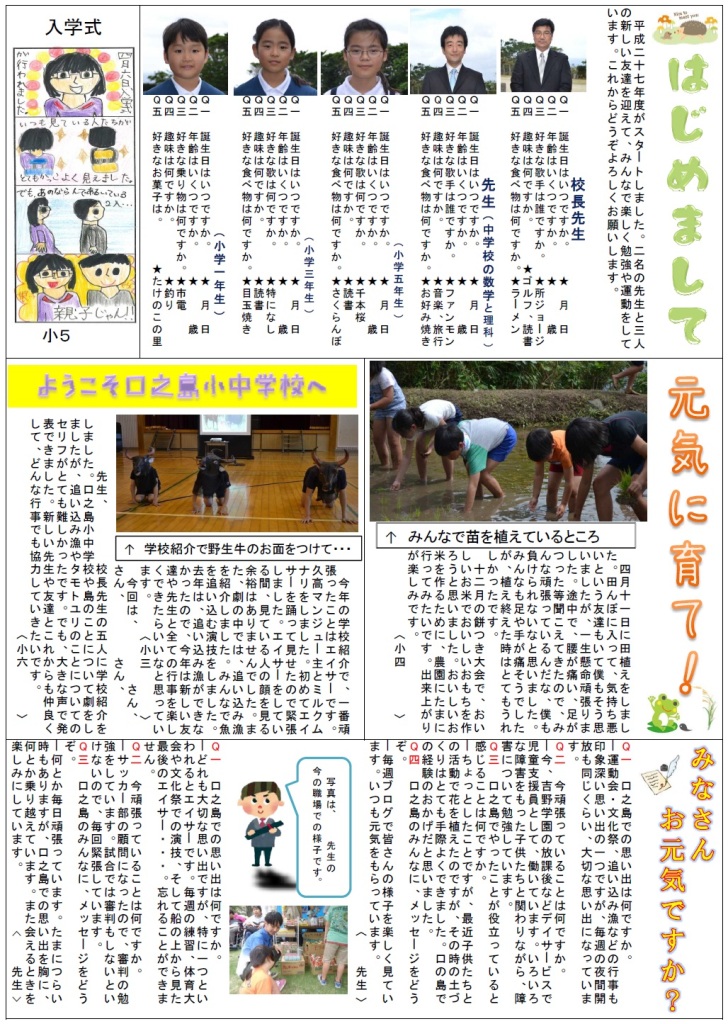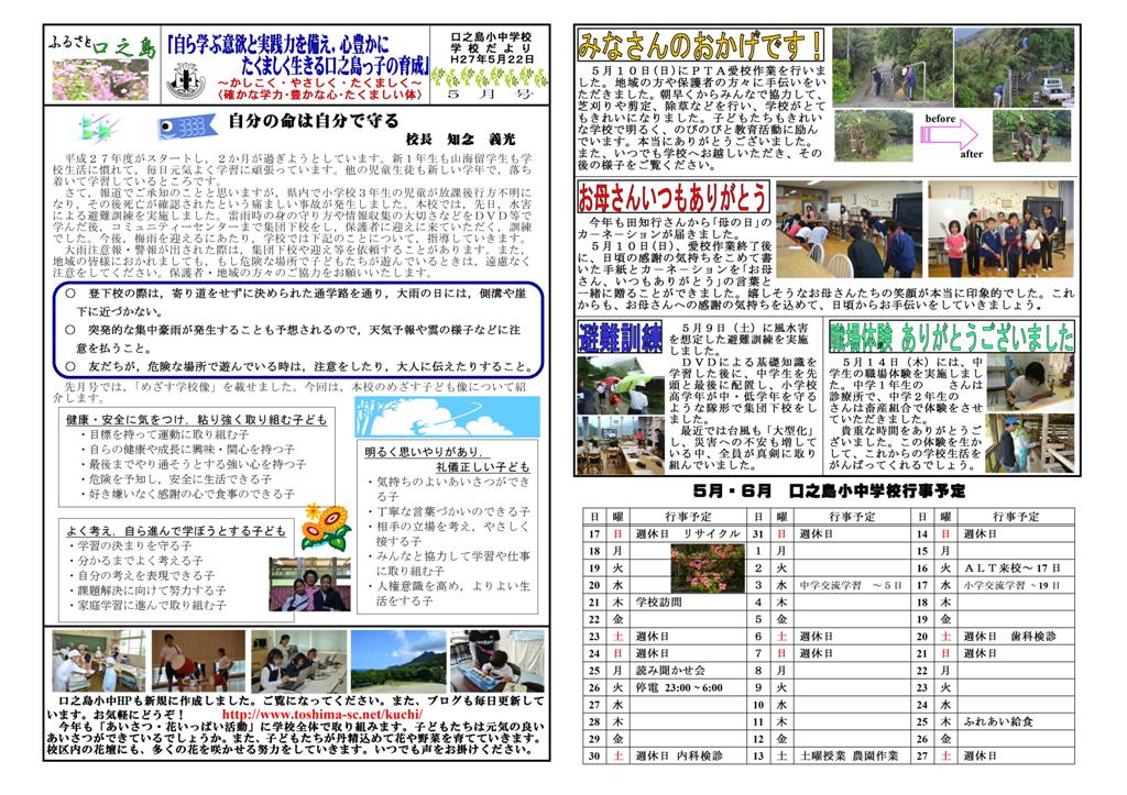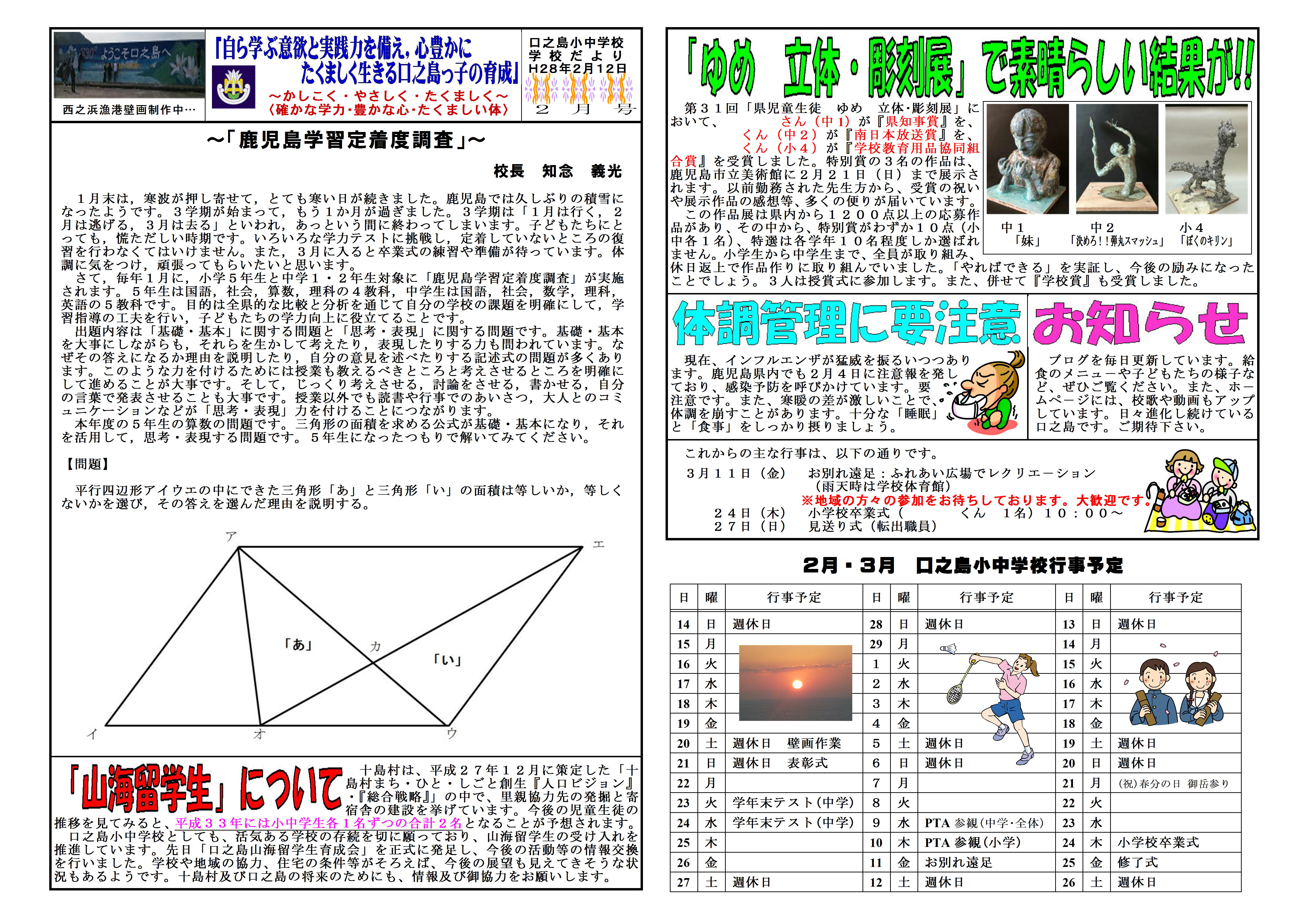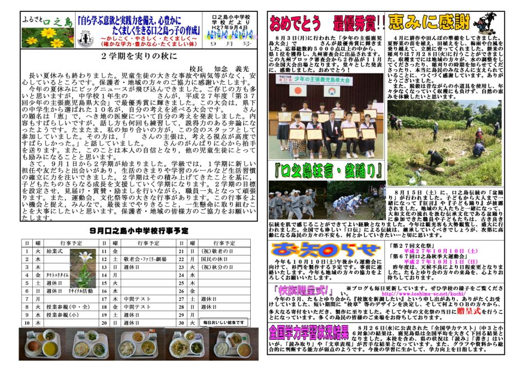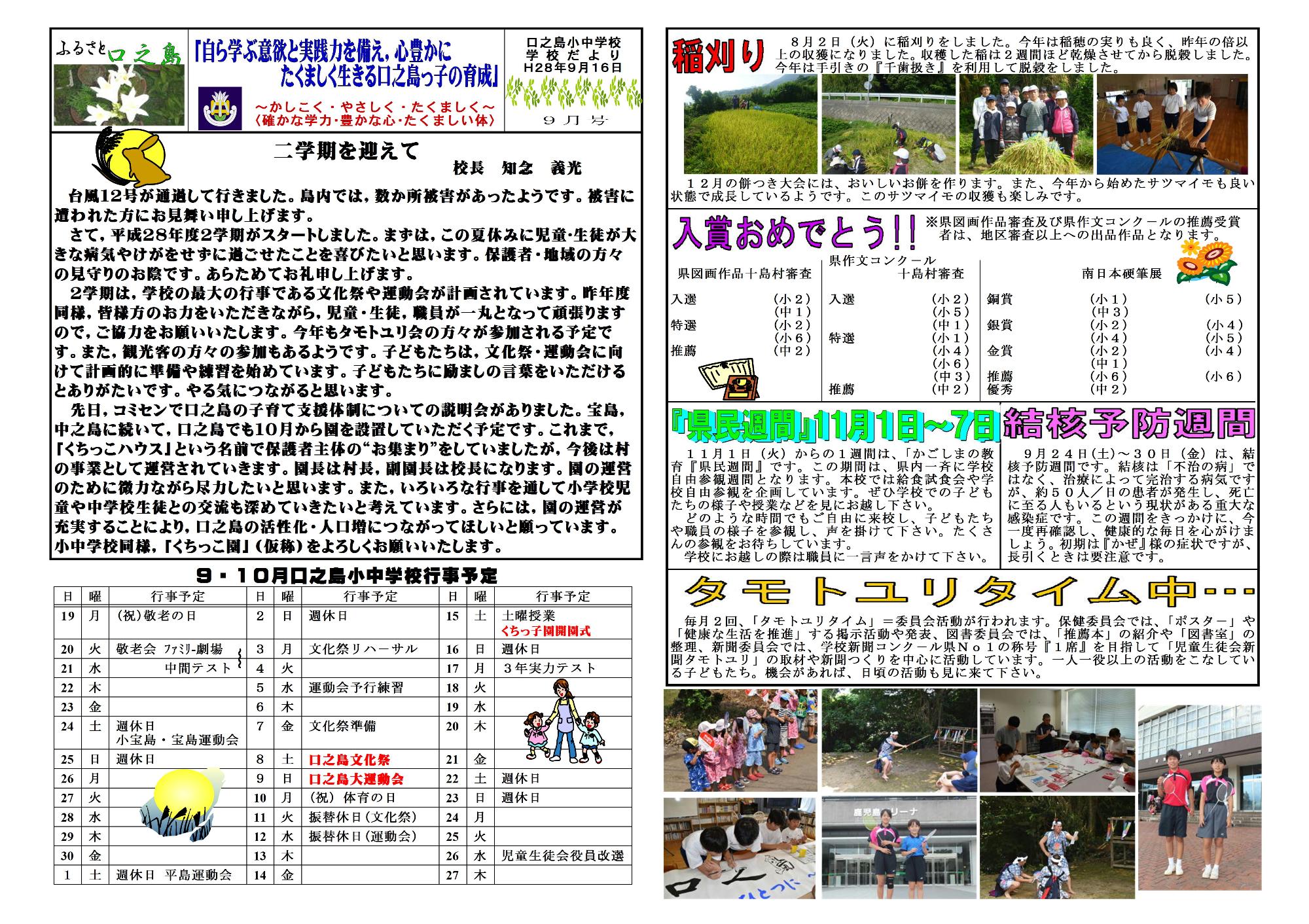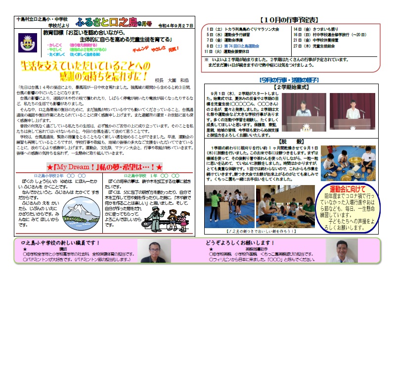 毎月発行している,「学校だより」を掲載します。PDF形式を見るには,「Adobe Reader」等の閲覧ソフトウェアが必要です。画像形式はそのままご覧いただけます(画像はJPEG形式です)。なお,プライバシー保護のため,写真にはぼかしを入れ,個人名等は削除してありますのでご了承下さい。