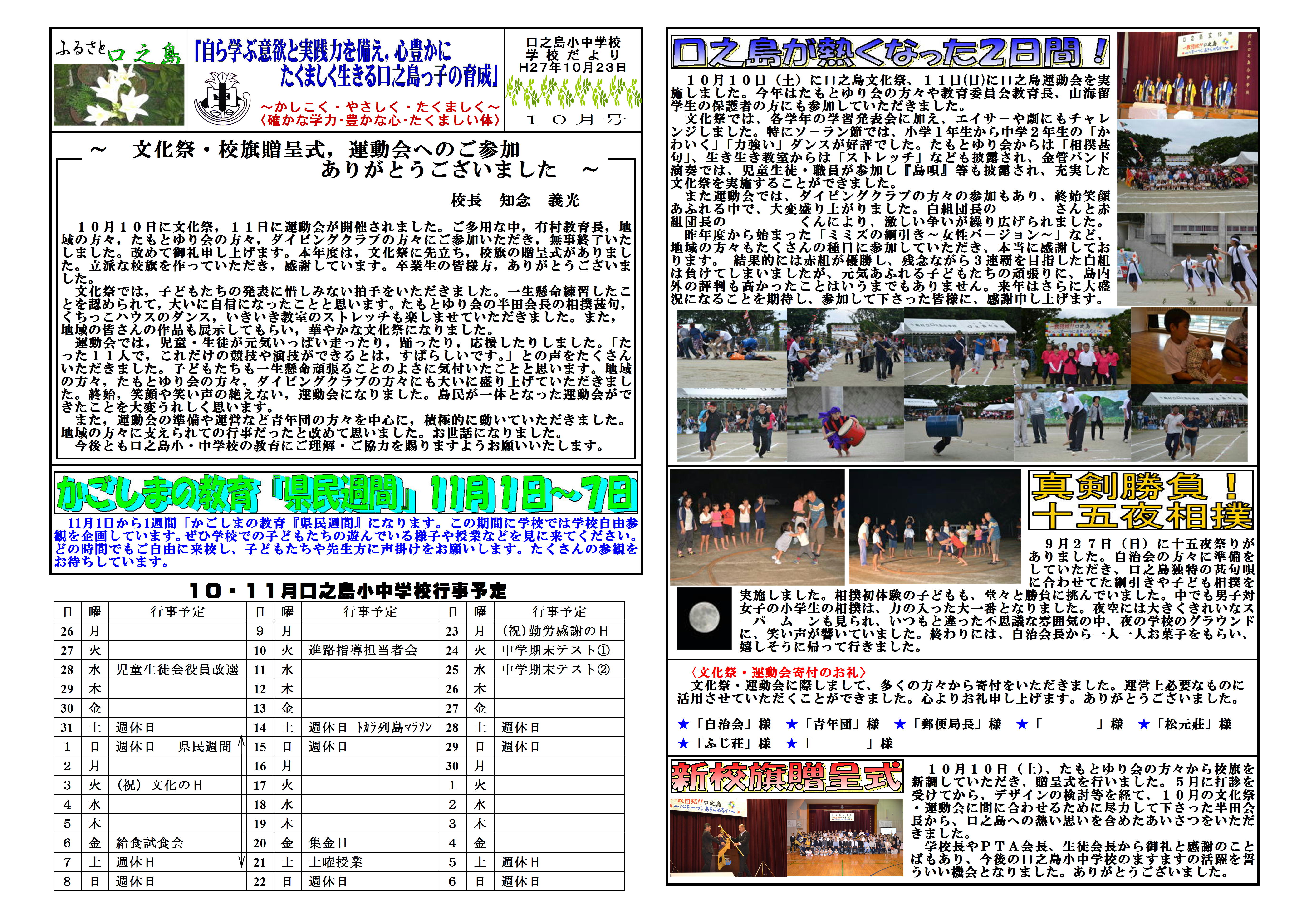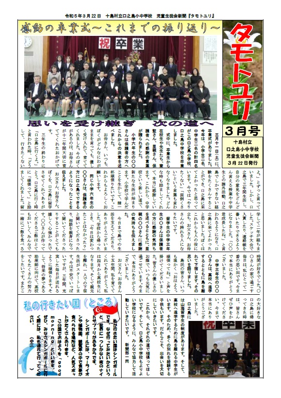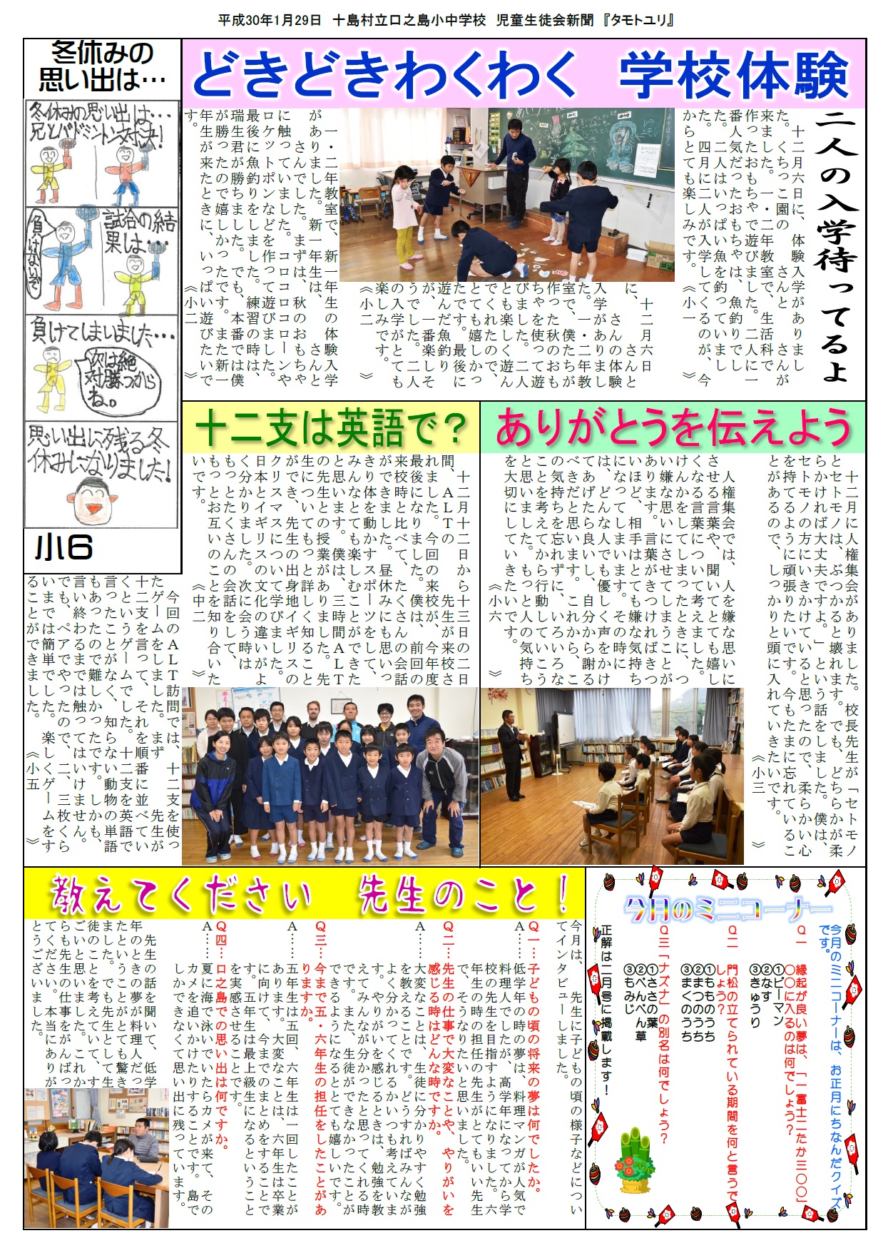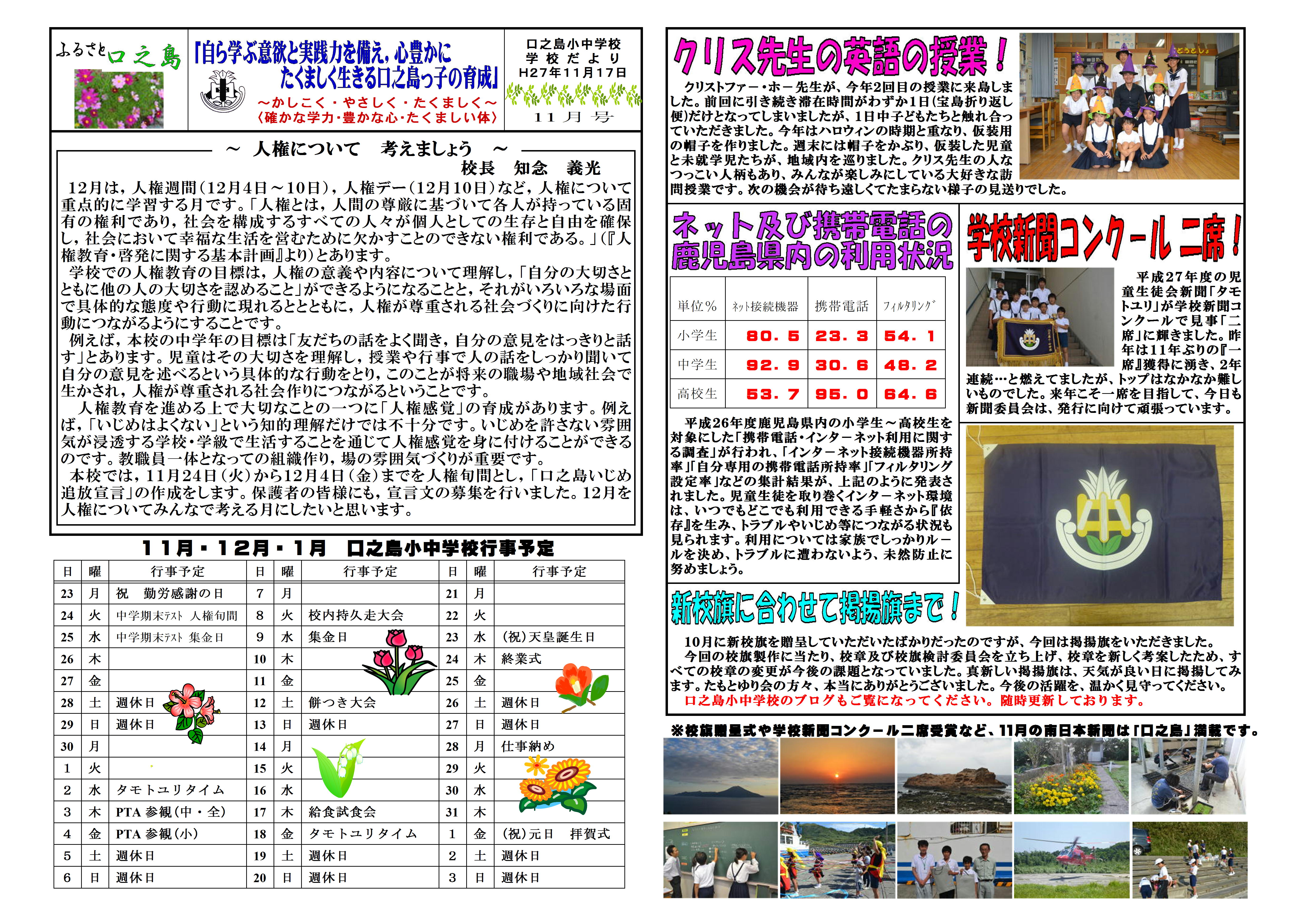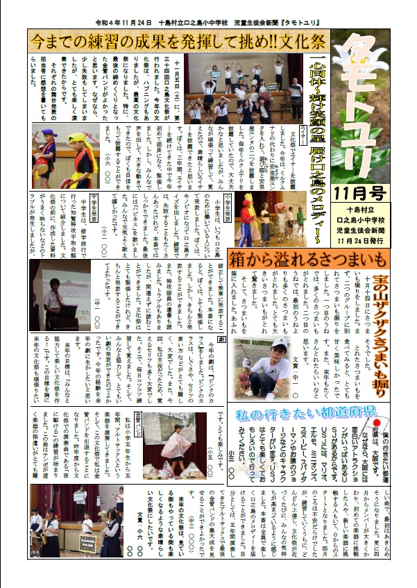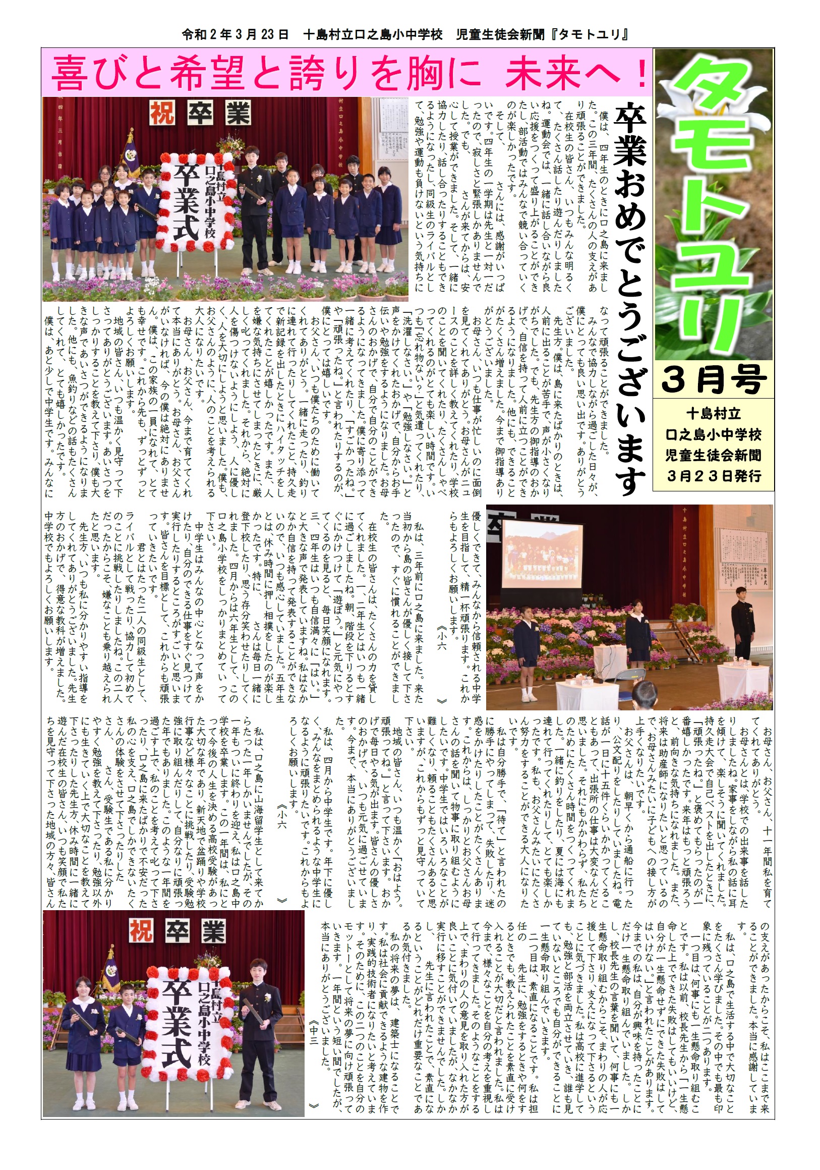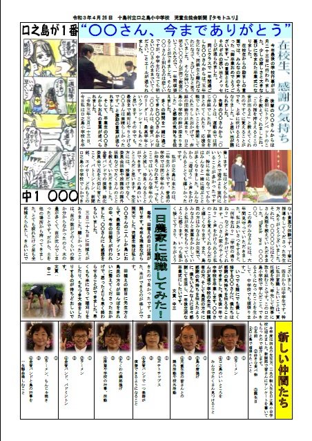 毎月発行している,「学校だより」を掲載します。PDF形式を見るには,「Adobe Reader」等の閲覧ソフトウェアが必要です。画像形式はそのままご覧いただけます(画像はJPEG形式です)。なお,プライバシー保護のため,写真にはぼかしを入れ,個人名等は削除してありますのでご了承下さい。