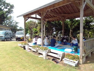 宮鶴女と書いて「みやじんじょ」と読みます。旧盆の 時期に行われる平島の伝統行事です。大庭で丸く なって踊ったり,島の数箇所で舞を納めたりします。 右手に扇子,首にタオル,左手に「どっしん俵」を持って 踊ります。どっしん俵は,自分たちで作ります。 |