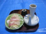 福徳神を迎える家庭では,なますに刺身をのせた 料理とお酒を準備して,家族全員が並んで福徳神を 待ちます。 |
