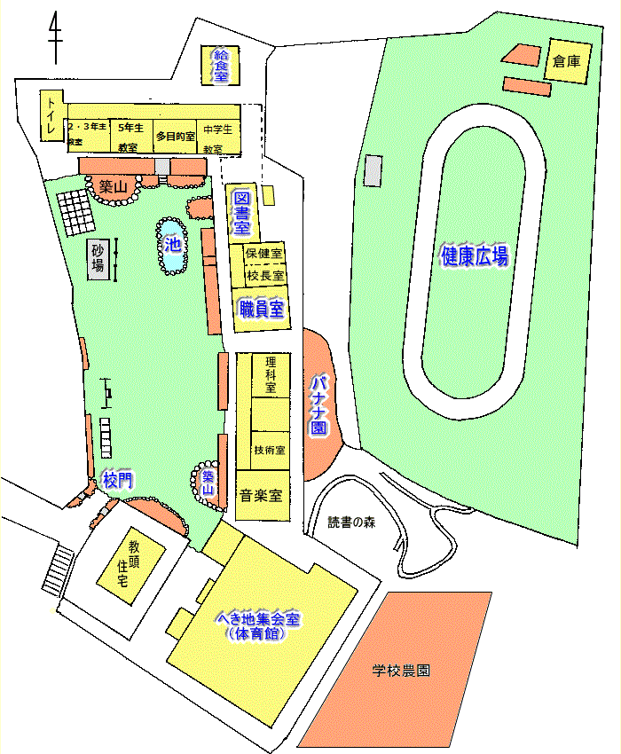 平島小中学校の校内を案内します。見たい場所(青い文字)にマウスをのせると画像と説明が出ます。