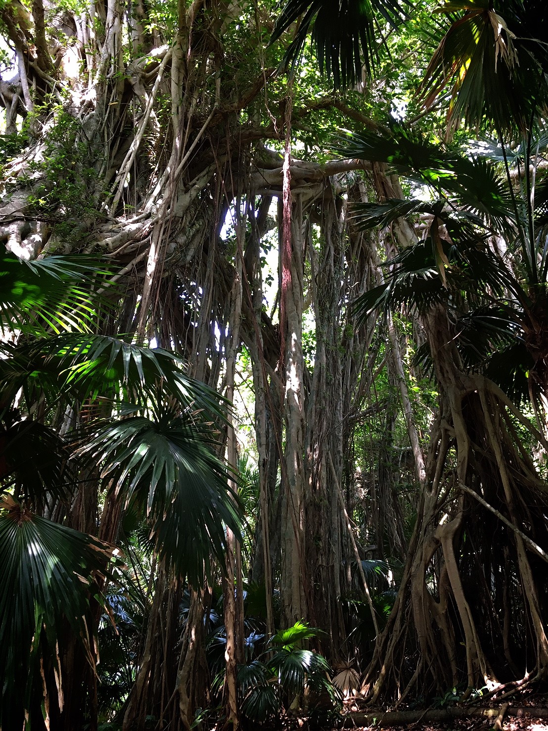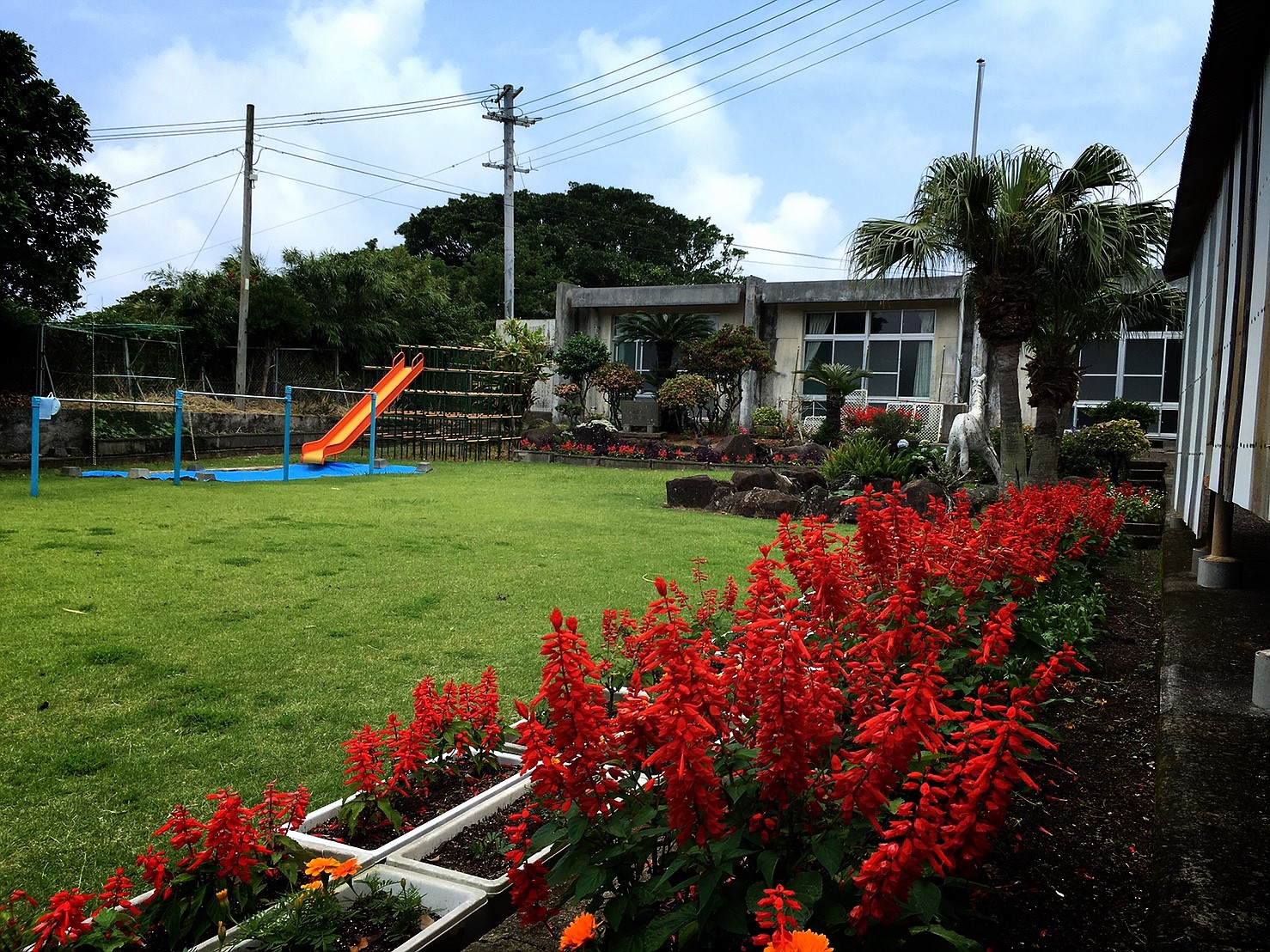 越冬したサルビア「春の頃の学校」 学校のすぐそば「千年ガジュマル」 夏には水泳学習「東之浜海岸」