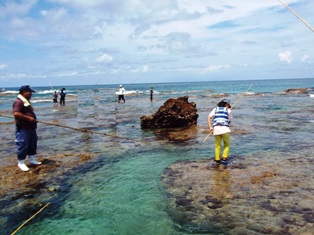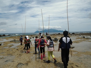 | 穴釣りを体験しました。 竹に釣り糸を付けただけの簡単な仕掛けですが,だからこそ,魚がかかった時の手の感触が素晴らしいです。 |