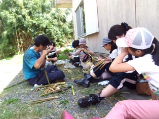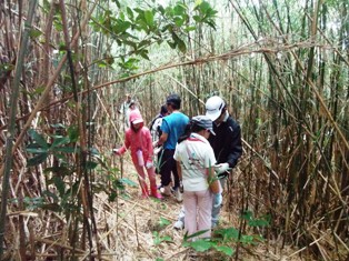 | 筍採りを体験しました。島の方の先導で,竹山の中に入っていきます。 |