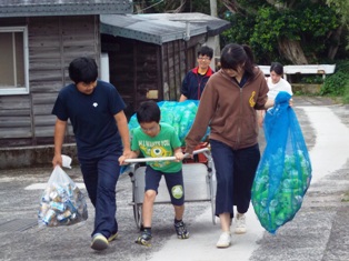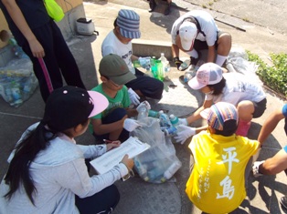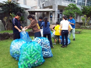 小・中学生全員で空き缶や空き瓶,ペットボトルを集めます。